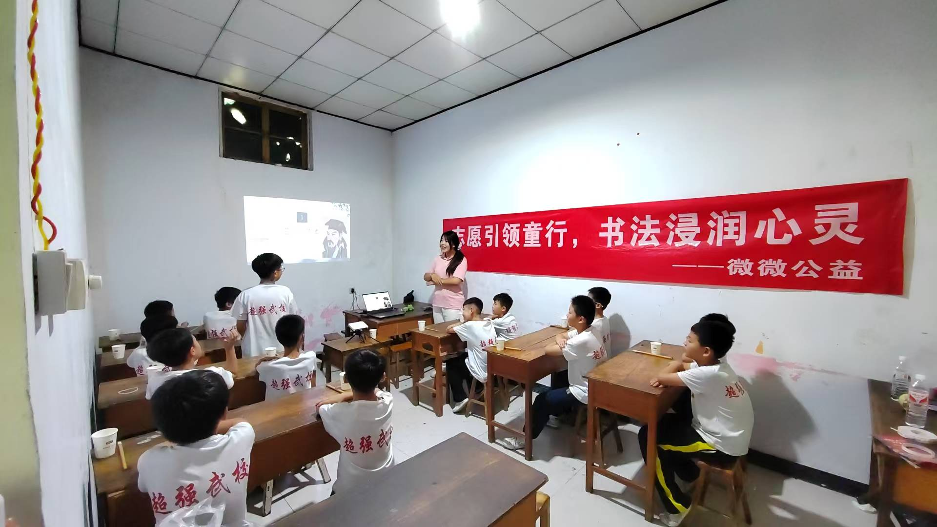 活动当天,武校的教室充满着浓厚的文化氛围。微微公益志愿服务团队的志愿者们身着统一的服装,面带微笑,与武校的孩子们亲切交流。志愿者们带领孩子们进入书法教室,首先介绍了书法的历史渊源以及临沂市的古今书法名人,激发了同学们对书法的好奇和兴趣。