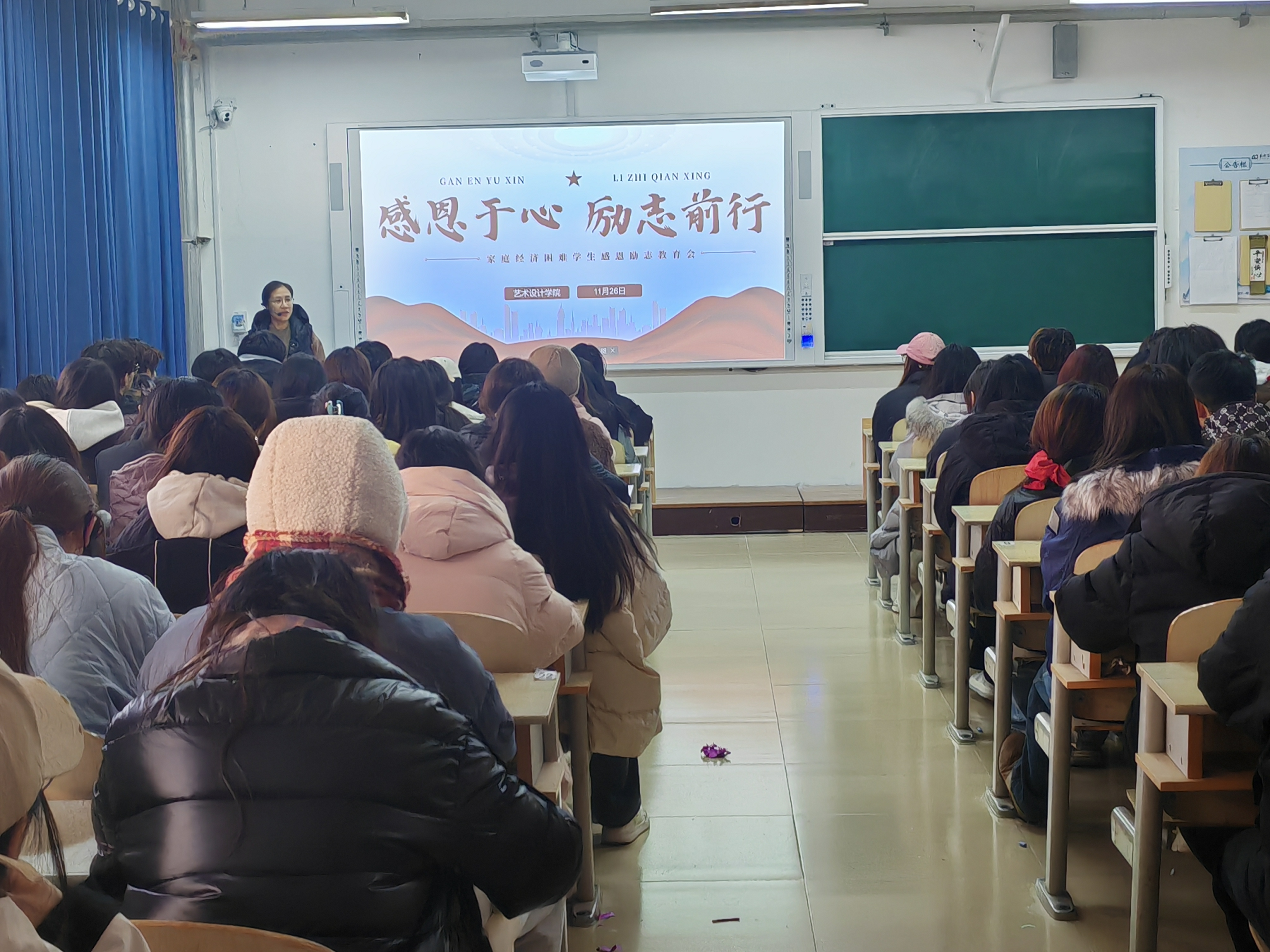 本站讯 11月26日,艺术设计学院在1B304教室举行“启航梦想·感恩前行”家庭经济困难学生感恩励志教育活动。此次活动旨在教育引导学院家庭经济困难学生深刻感恩国家和学校的资助政策,合理规划使用受助资金,并强化防范诈骗的意识,避免陷入不良消费陷阱。