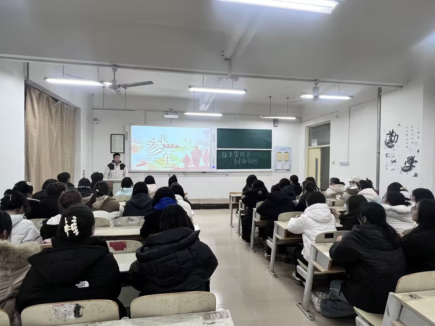 退役复学士兵李建民宣读了2025年参军入伍的相关政策,在强军召唤、基本要求、优待政策、先进典型和应征报名5个方面进行了详细介绍,为同学们解答了关于身体条件、复学升学优待、经济补贴、就业安置和报名时间方式等方面的问题,还结合自身经历给在场的学生们描述了真实难忘的军旅生活,讲述入伍初心,分享了在部队的所见所闻、所思所感、所获所得,鼓励同学们将征兵入伍作为提升自我的桥梁,将个人理想与富国强军相结合,把个人成长融入强国梦、强军梦的伟大实践中。