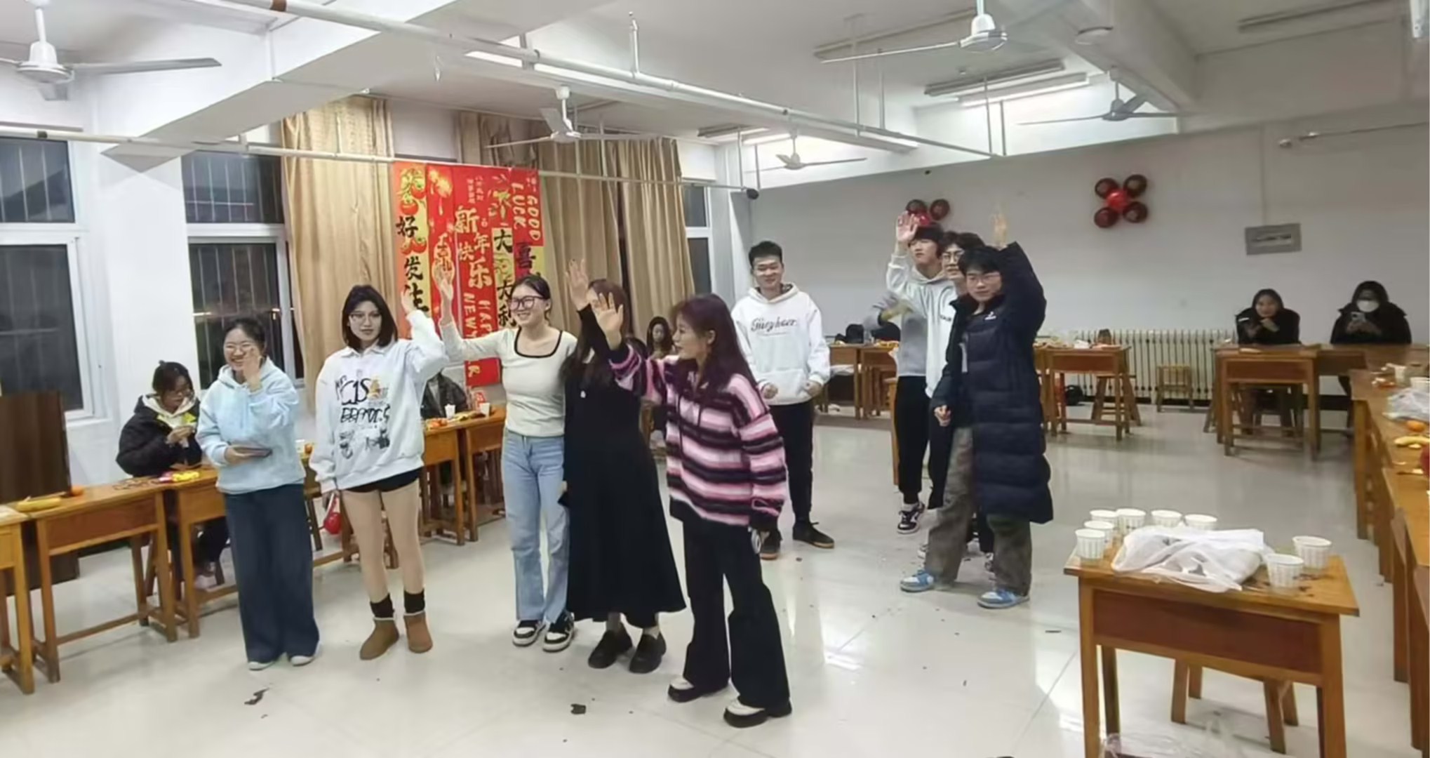 一些班级以茶话会的形式,为同学们营造了轻松愉悦的交流氛围。活动现场,彩色气球、拉花等点缀其中,洋溢着浓厚的新年氛围。同学们围坐在一起,桌上摆满了各式各样的茶点和水果。大家一边品尝美食,一边畅所欲言,分享着过去一年的收获与成长,对新的一年充满了憧憬和期待。茶话会期间,同学们纷纷展示才艺,将现场气氛推向高潮。动听的歌声萦绕在教室,每一个音符都传递着青春的活力与对新年的美好祝愿;活力四射的舞蹈让大家感受到了青春的激情与无限可能。