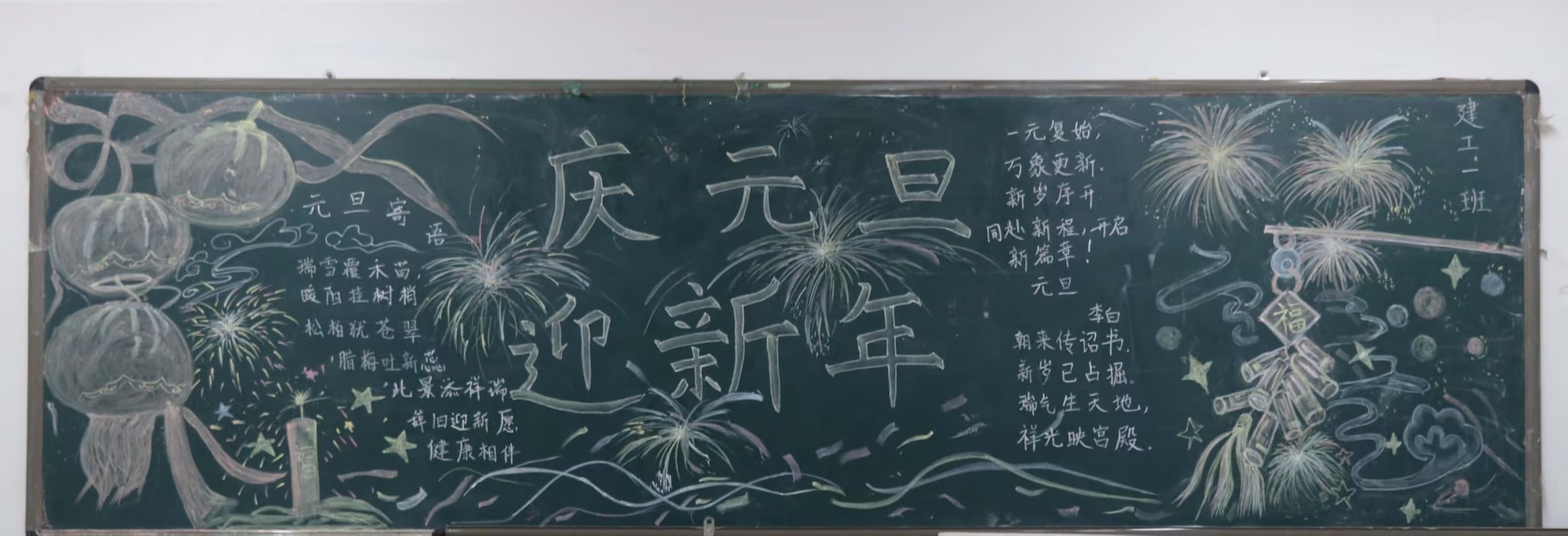 经过数天精心创作,一些班级精心装扮了喜迎元旦的黑板报。有的用绚烂色彩勾勒出金蛇戏珠与红灯高挂的画面,有的以立体剪纸风格展现爆竹声声迎新年的热闹。24设计2班以金蛇盘绕为主线,周围点缀传统红灯笼,将传统文化与生肖元素巧妙融合,展现出对新年的美好期许。24建工1班将爆竹元素与灯笼线条结合,用细腻笔触描绘出高空爆竹绽放的场景,寓意学院在新的一年如爆竹般蓬勃发展。