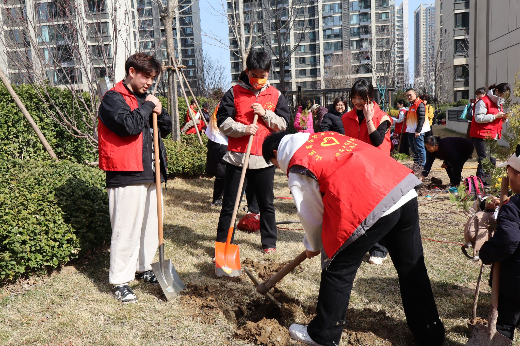 在植树活动现场,志愿者们各司其职,默契协作,从挥锹铲土、扶苗填坑到培土浇水,每一个步骤都展现出他们对生态建设的责任与热爱。志愿者们身着红马甲,在绿意盎然的树苗间穿梭,形成了一道独特的风景线,彰显了雷锋精神的传承与发扬。他们以行动致敬雷锋,用满腔热情和无私爱心,绘制出新时代的“志愿红”。