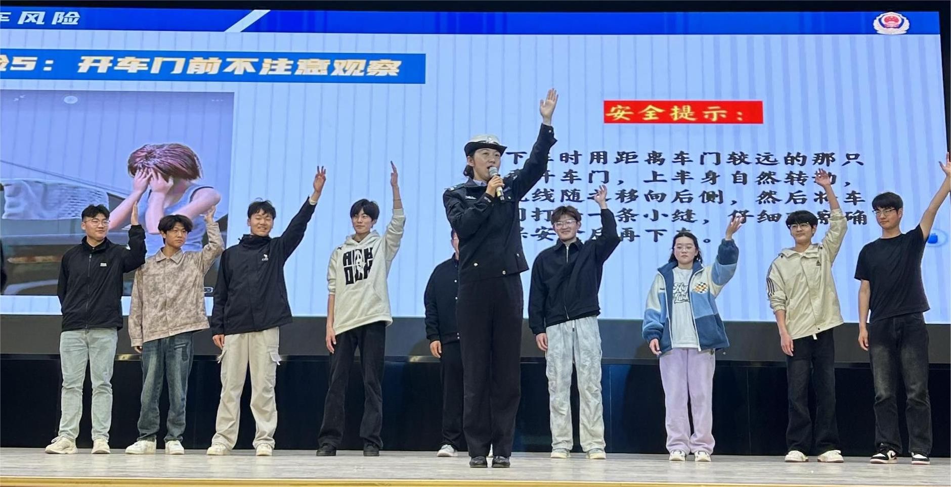 为增强教育效果,讲座精心设置了多个互动环节。在宣传推广方面,宋警官鼓励学生将精心挑选的交通安全宣传标语分享到朋友圈,呼吁更多同学关注交通安全,点赞数靠前的同学还获得了精美小礼品。在安全实操演示环节,宋警官现场示范反手开车门的正确方法,有效提高了学生下车时的安全意识,保障了骑行人员的安全。在“一盔一带”实操环节,宋警官邀请学生上台参与“安全头盔佩戴”体验,并现场演示安全头盔的正确佩戴方法。体验的学生感慨道:“这次活动让我深刻认识到,原来安全头盔佩戴不正确,在事故中很可能直接脱落,交通安全绝非小事,而是关乎生命的大事。”