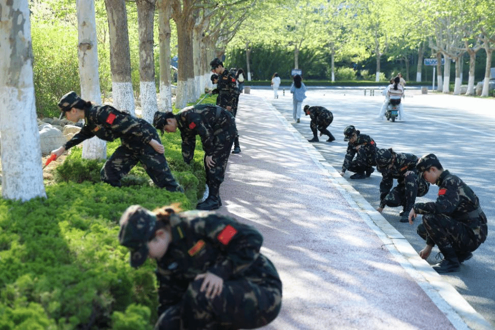 晨光熹微中,队员们身着笔挺的迷彩服,携带清洁工具在国旗广场整齐列队。随着一声令下,大家分组深入校园主干道、操场、绿化带、宿舍楼周边等区域,俯身捡拾烟头、纸屑、塑料瓶等,细致清理卫生死角,并对垃圾进行分类处理。烈日下,队员们的衣衫逐渐被汗水浸透,但始终保持着严谨的纪律性和高昂的热情,弯腰清扫的身影、认真分类的动作,既是对劳动的尊重,更是对“奉献精神”的生动诠释。