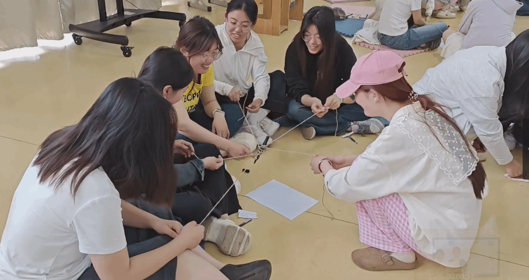 活动现场,“糖衣炮弹”游戏率先拉开帷幕。老师将学生分为每组8人左右的小组,发放彩色便利贴后,同学们在5分钟内将赞美话语写在贴纸上制成“糖果”。随后,大家有序送出“糖果”,遵守规则完成传递与接收。组内交流时,朗读赞美词的声音此起彼伏,每个人脸上都洋溢着幸福笑容。紧接着,“绳笔写字”游戏登场。3—6人一组,用绳子系笔共同书写“5·25我爱我” 。尽管控制笔的走向困难重重,但在小组成员默契配合下,饱含自我关爱的话语最终呈现,让同学们深刻体会团队合作与关爱自我的意义。“地名猜猜乐”环节充满紧张刺激。老师展示图片后,两组同学激烈抢答,大家全神贯注、争相举手,现场气氛热烈。该游戏既拓宽知识面,又激发了团队荣誉感。最后,“情绪画卷”游戏将活动推向高潮。10分钟内,同学们用彩笔描绘当下或近期情绪体验。展示环节中,一幅幅色彩斑斓的画卷、一个个真挚的故事,不仅让同学们更清晰觉察自身情绪,也在分享中增进了彼此的理解与情感共鸣。