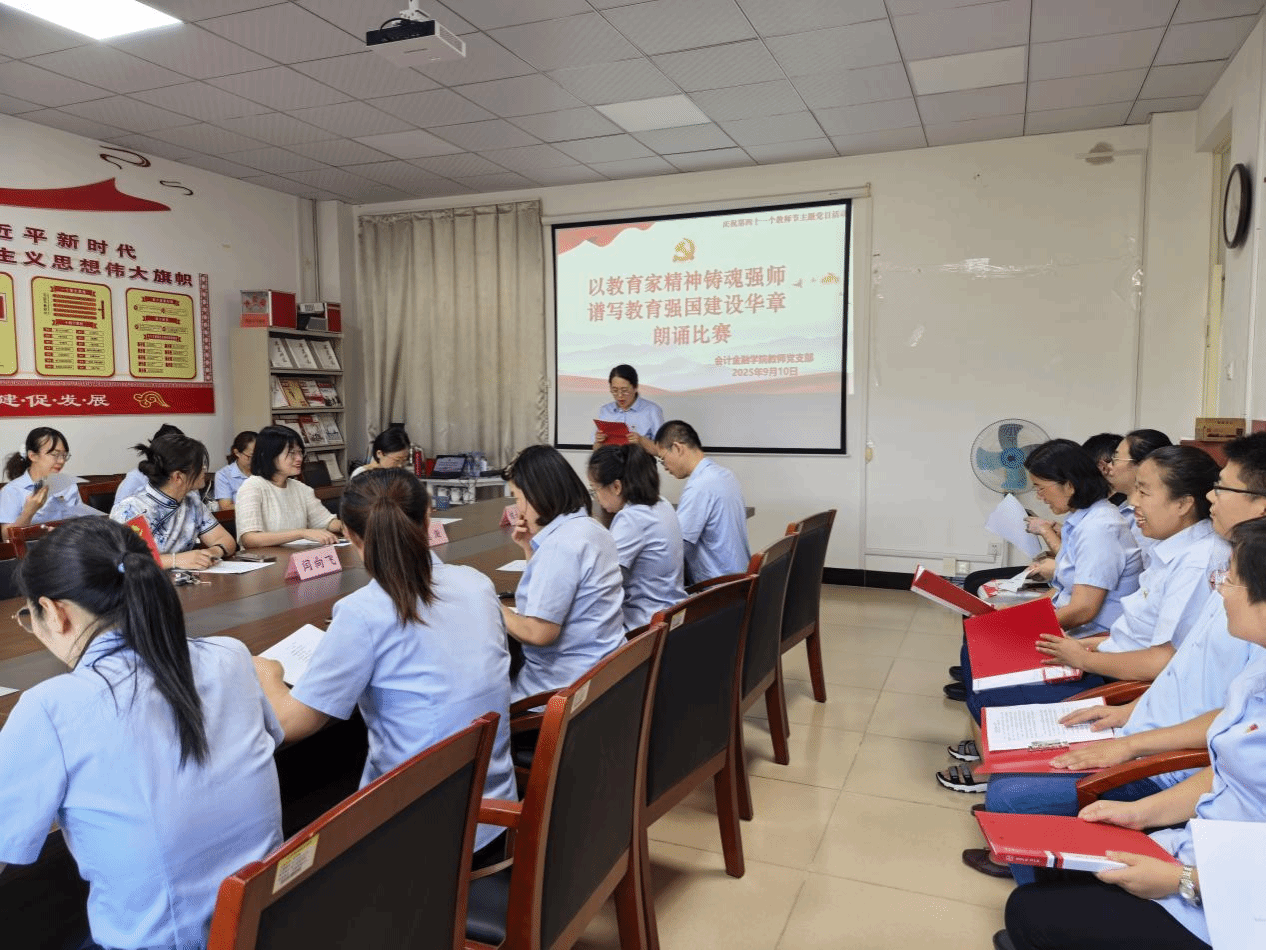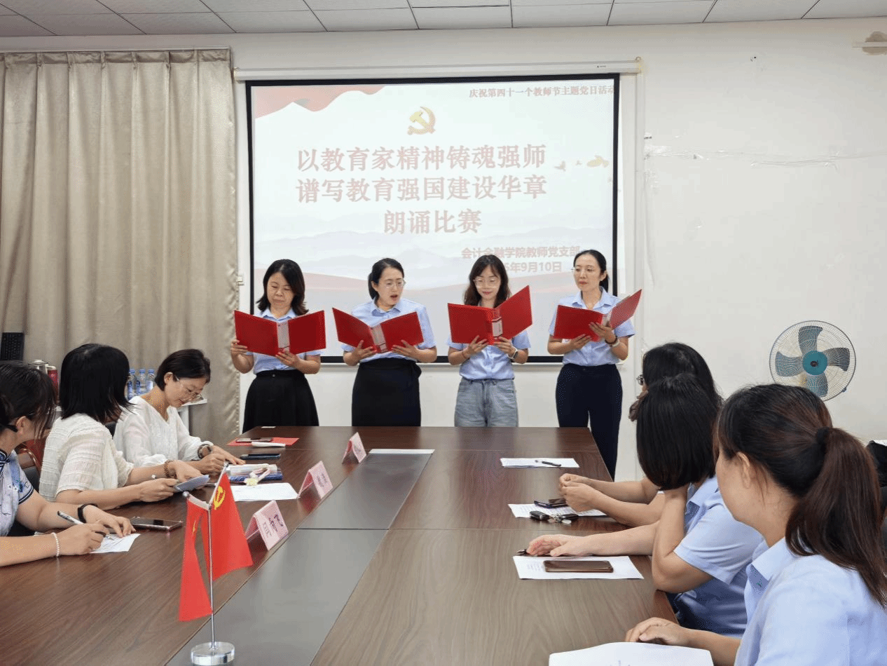 本站讯 在全国第41个教师节来临之际,“以教育家精神铸魂强师,谱写教育强国建设华章”教师节朗诵比赛于9月10日下午在会计金融学院会议室隆重举行。本次活动由会计金融学院教师党支部书记邹婷主持,邀请马克思主义学院教师作为评委,通过诗歌朗诵的形式,礼赞教育初心,凝聚育人合力,展现新时代教师风貌。