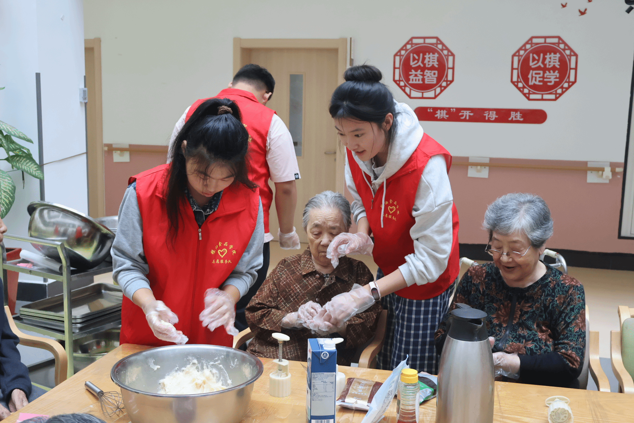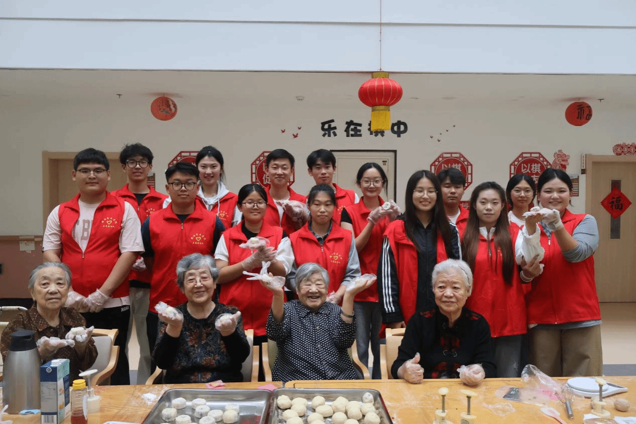 学生志愿者现场演示冰皮月饼制作工艺,详细讲解面皮揉制、馅料配比、包馅手法等关键技术。志愿者与老人们结成对子,共同投入制作过程:青年教师俯身耐心示范,帮助老人掌握饼皮包裹馅料的技巧;学生们则在一旁细心协助,彼此默契配合。尤其令人动容的是,一位101岁高龄的老奶奶虽双手微颤,却始终神情专注,在志愿者的轻声鼓励与协助下,顺利完成了一个个月饼的制作。一个个精致饱满的冰皮月饼在欢声笑语中诞生,活动现场弥漫着清甜的香气,更涌动着党群同心、老少同乐、师生共融的温暖情谊。