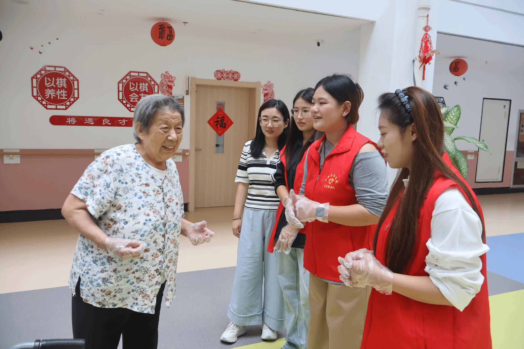 随后,师生党员与志愿者走进山东健康颐养中心开展实践活动。银发长者与青春学子共同用歌声表达对党的忠诚与对祖国的热爱,合唱《没有共产党就没有新中国》,让红色基因在代际共鸣中传承。志愿者们悉心聆听老一辈讲述奋斗故事,其中特别探望了学院毕业生的奶奶。老人深情回忆起孙子在校求学的往事,对学校的培养表达感激。这一暖心互动,不仅是校庆期间对校友家庭的亲切回访,更是学校“以生为本”育人理念的生动体现,架起了连接学校历史与未来、校友与母校的情感桥梁。