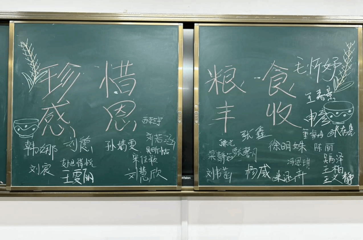 9月23日秋分当日,学院利用班会时间开展“珍惜粮食·感恩丰收”主题班会。学生代表在黑板上郑重签名,承诺“按需取餐、杜绝浪费”。签字承诺不仅是仪式,更是将“节约”二字从笔尖刻入心间的第一步。现场还通过展示“一粒米的一生”“全球饥饿地图”等图片,引导学生思考粮食安全的意义。