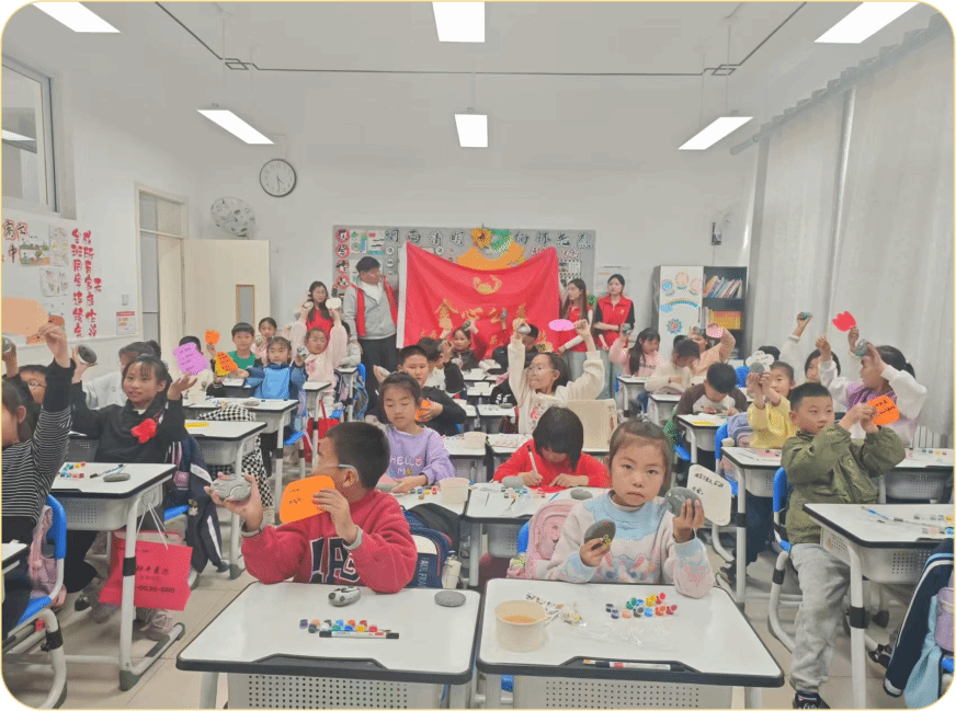 在志愿者的协助下,孩子们纷纷动手创作。一双双小手在石头上认真描绘,尽管过程中偶有急切与紧张,但在志愿者的耐心引导下,孩子们逐渐调整心态,充分发挥想象力,完成了一件件生动可爱的石画作品。看到自己亲手创作的作品,孩子们脸上洋溢着自豪与喜悦。