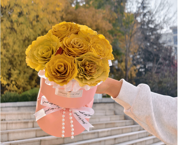 专业教师躬身其间,或示范叶片叠卷的巧法,或点拨花束构图的妙思,悉心带领同学们创作。大家眼眸含光,笑意温婉,指尖轻拾金黄银杏,于路旁随性围坐创作,指尖起落间皆是意趣。或捻叶叠卷如瓣,错落粘贴成盛放的花束;或取草帽为基,缀叶成纹,让叶脉的纹路在帽檐间舒展成趣。已成型的叶花轻捧掌心、叶帽斜簪发间,将校园小径化作流动的自然艺术台,更映照着师生共研、灵动鲜活的青春图景。