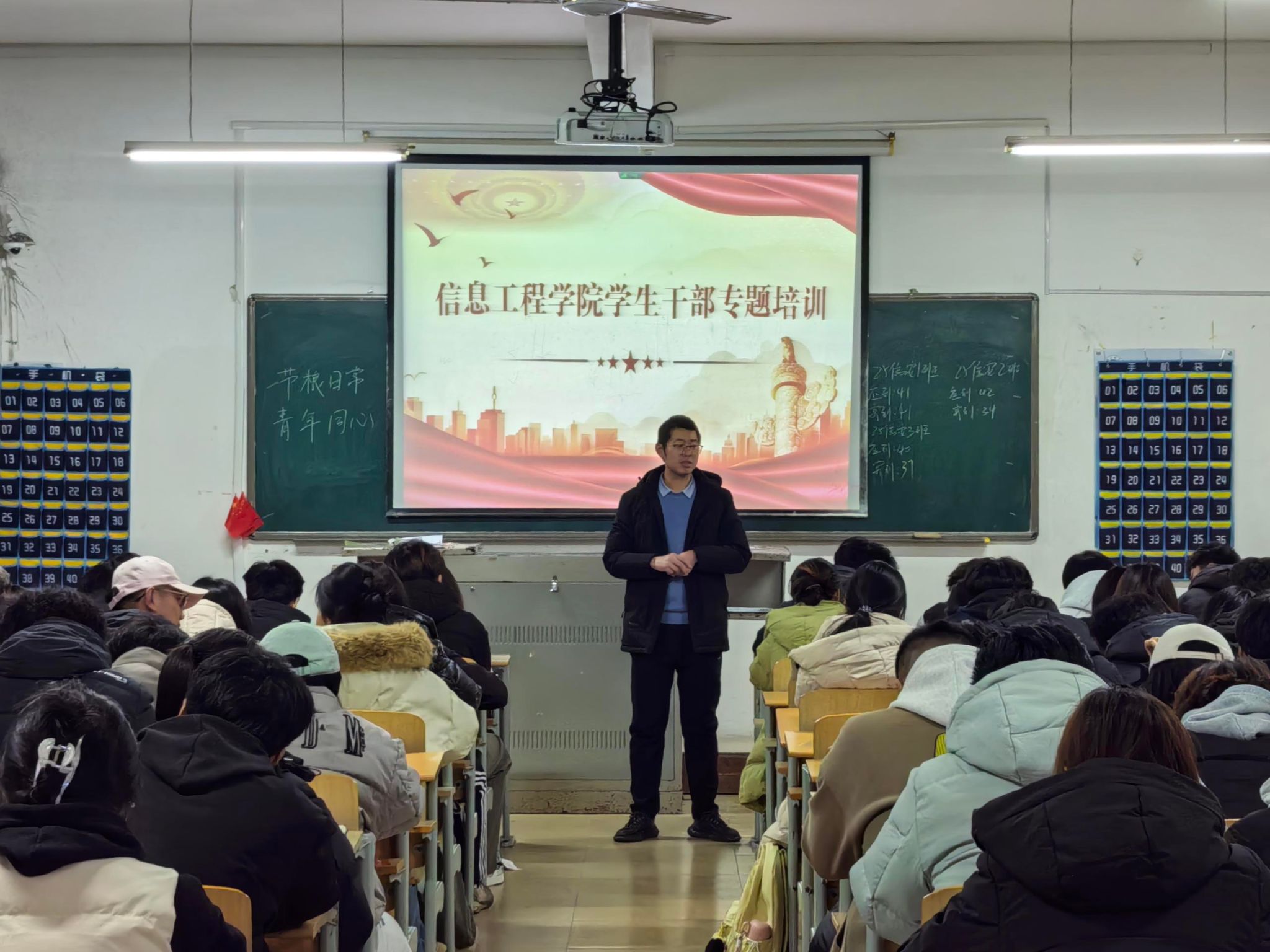本站讯 为加强学生干部队伍建设,提升学生骨干的综合素养与责任意识,12月9日下午,信息工程学院开展学生干部专题培训。学院学生科科长巩斌担任主讲,2024、2025级全体学生干部参加培训。