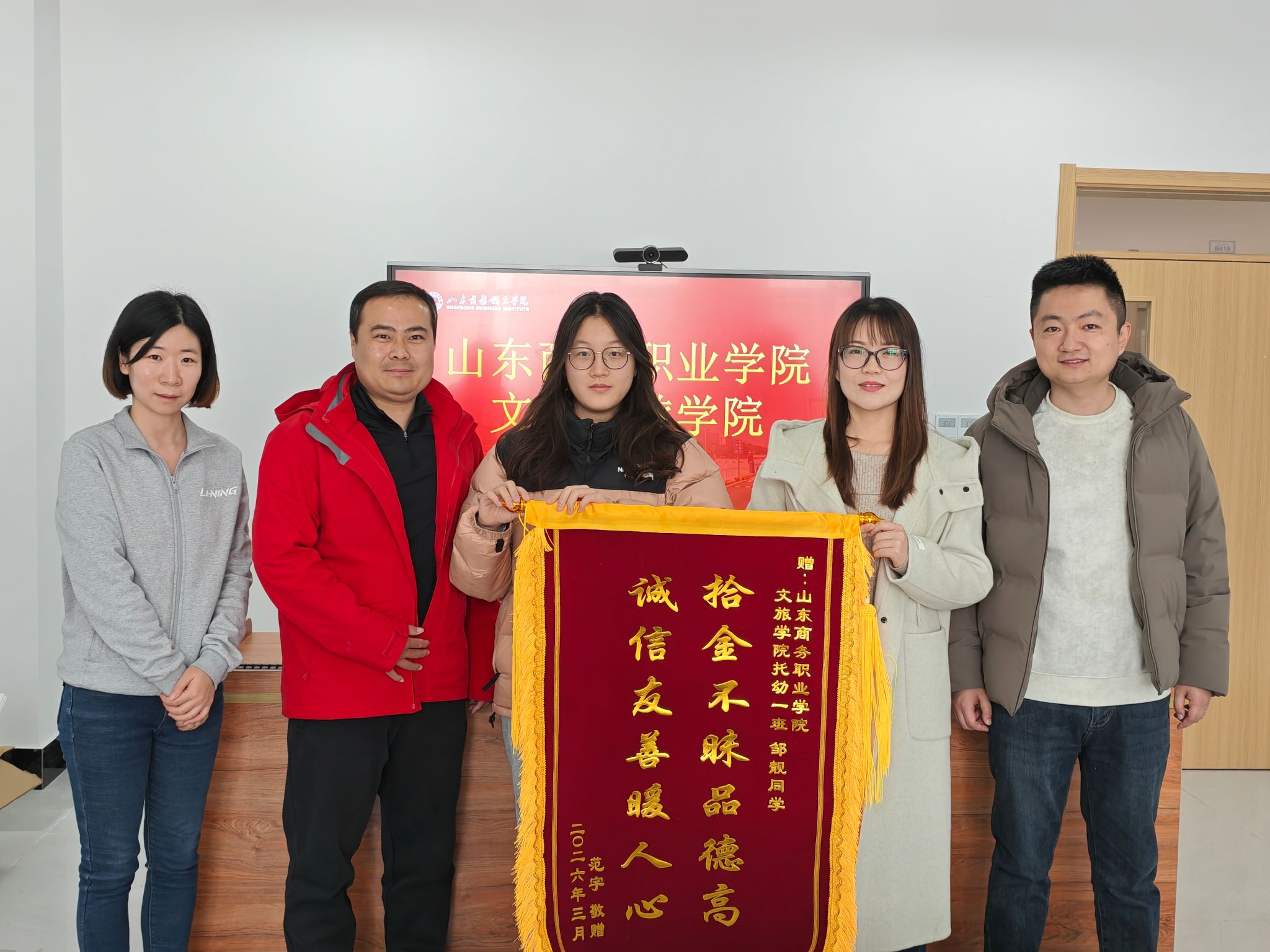 一面锦旗,承载的是双向奔赴的感恩与认可;一次善举,彰显的是融入血脉的品格与坚守。多年来,学校始终将思想政治教育与品德培育贯穿人才培养全过程,把社会主义核心价值观融入教育教学、日常管理的每一处细节,着力培养既有扎实专业本领、更有高尚道德情操的新时代青年人才。此次拾金不昧的暖心善举,正是学校育人成果最鲜活、最生动的现实注脚,更生动诠释了学校“明德 立信 知行 匠心”校训的深刻内涵,也为烟台这座全国文明城市,增添了一抹动人的青春暖意。(通讯员:闫伟嘉 撰稿:郭新星 审核:葛琨 梁倩 值班审核:杜林梓)