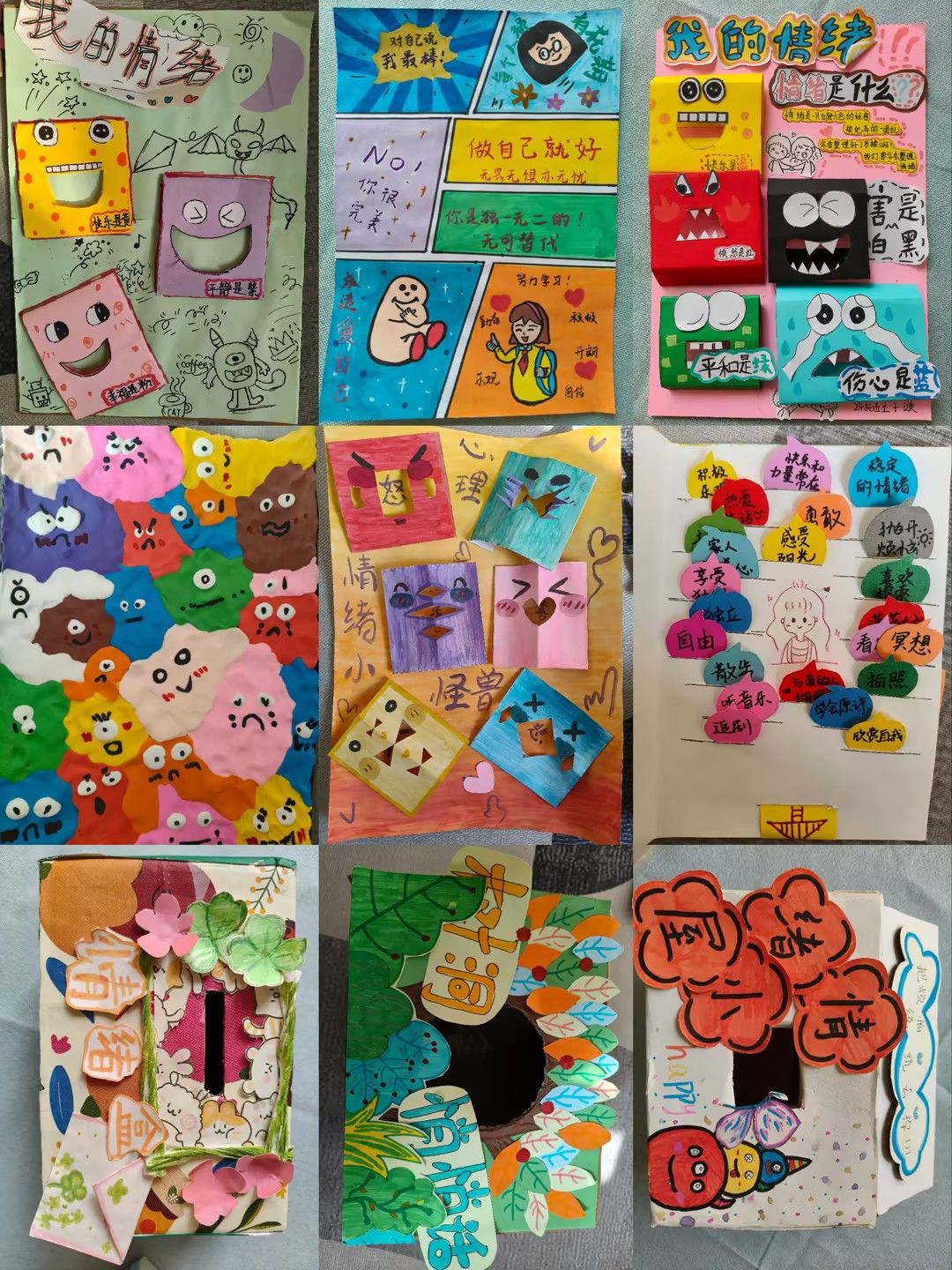 活动开展以来,得到了同学们的积极响应与热情参与。大家以双手为笔、以材料为墨,将对生活的热爱、对心灵的探索、对成长的感悟融入一件件创意作品中。24英二沈怡晴同学向大家介绍作品时说:“我用废旧纸盒打造了这座‘情绪小屋’,在盒身开了投递口,搭配可爱的小怪兽插画和‘把烦恼统统去掉!!!’的文字,希望它能成为大家的情绪收纳站。”25托四马金昱同学则说:“我画了一个情绪圆盘,用不同色彩和纹理划分出焦虑、孤单、平静、愉悦等八种情绪状态,底部写下‘情绪背后是需求’的核心主题。这个想法来自心理课上老师的一句话——‘每一种情绪都在诉说一个未被满足的需求’。”