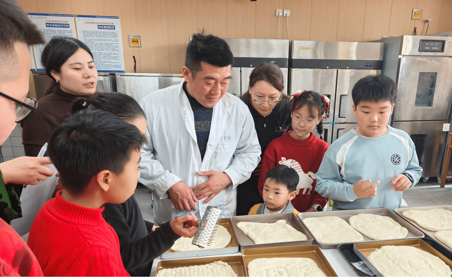 研学活动的实践体验环节在烘焙实训室内展开。于海洋老师作为实践指导教师,带领家长与孩子们走进面点的世界,开启指尖上的劳动教育课。在曲奇饼干与披萨的制作过程中,于老师逐一讲解原料配比、成型技巧等关键要点,手把手指导每一位学生完成操作。他特别强调精准称量的重要性:“制作美食需要精确计量,守护国家粮食安全同样需要科学精神与严谨态度。”