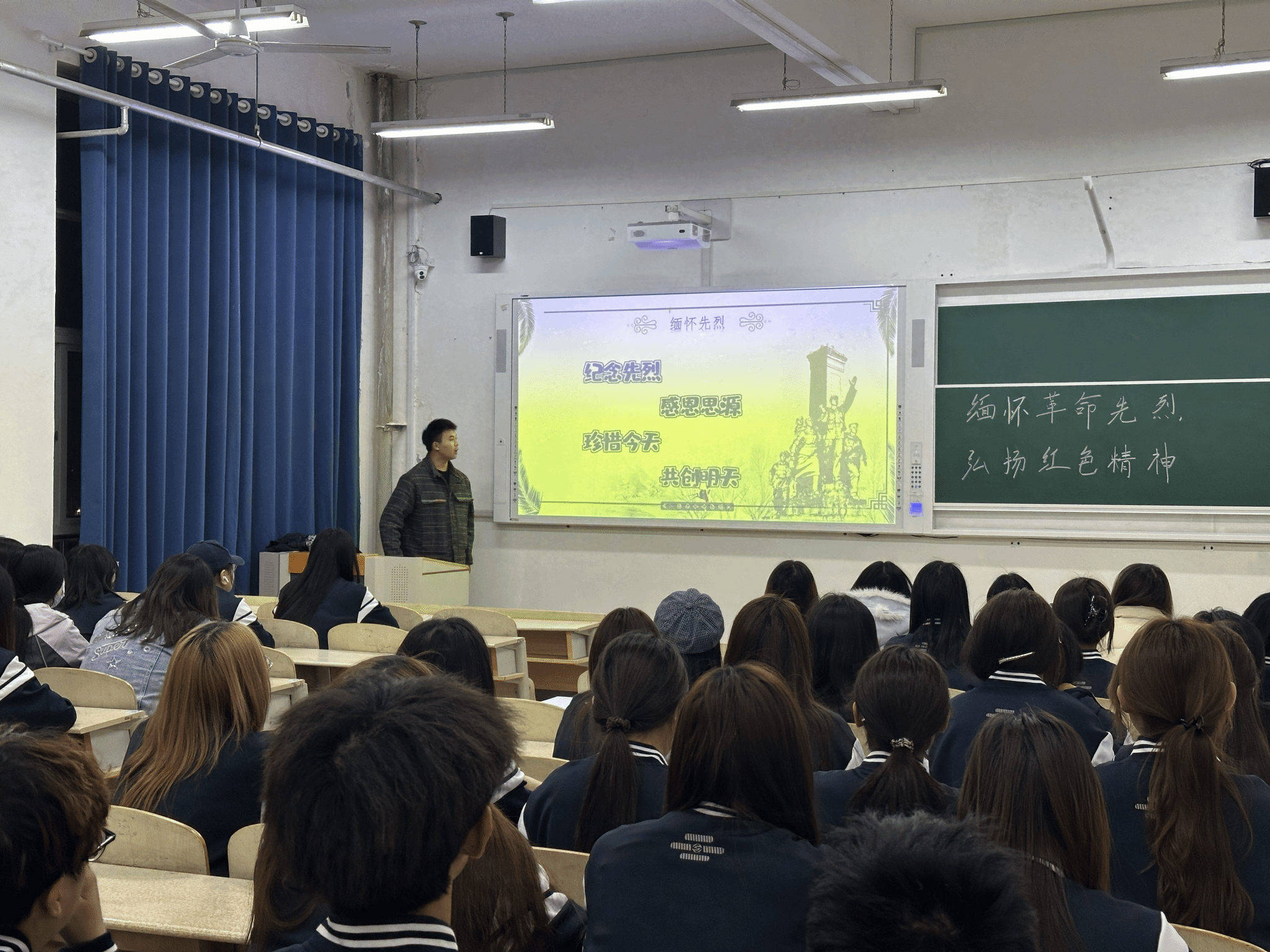 教室黑板上“缅怀革命先烈,弘扬红色精神”的标语醒目庄重,投影屏幕上“纪念先烈、感恩思源、珍惜今天、共创明天”的主题字样,传递着对革命先辈的崇高敬意。学生以清明祭英烈为切入点,系统梳理了清明节祭英烈的内涵,将传统节日的追思意蕴与革命精神的时代价值紧密结合,让同学们在了解传统习俗的同时,深刻理解“传承”二字承载的家国情怀。