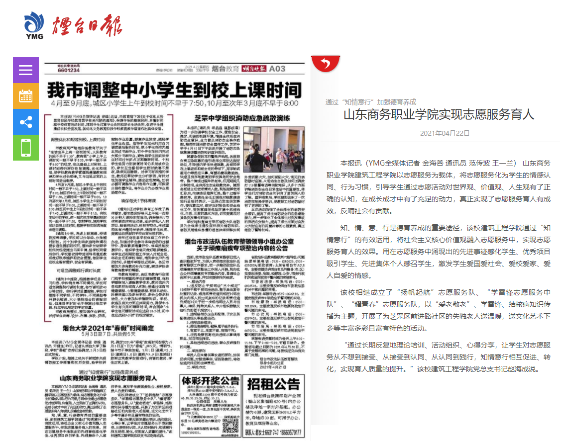 本报讯(YMG全媒体记者 金海善 通讯员 范传波 王一兰) 山东商务职业学院建筑工程学院以志愿服务为载体,将志愿服务化为学生的情感认同、行为习惯,引导学生通过志愿活动对世界观、价值观、人生观有了正确的认知,在成长成才中有了充足的动力,真正实现了志愿服务育人有成效,反哺社会有贡献。