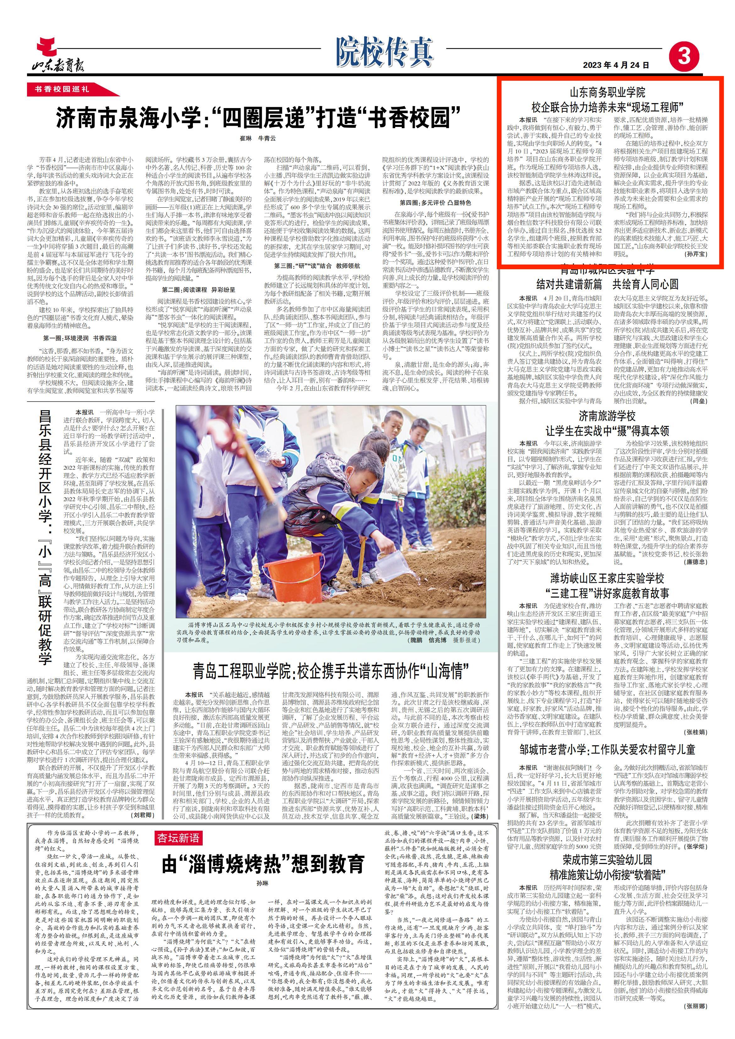 “我们将与企业共同努力,积极探索形成现场工程师培养标准,加快培养出更多适应新技术、新业态、新模式的高素质技术技能人才、能工巧匠、大国工匠。”山东商务职业学院校长王发明说。(孙芹宝)