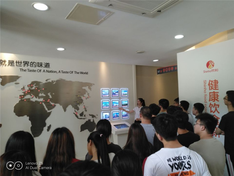 本次认知实习活动是根据食品生物技术专业教学计划安排,和人才培养方案要求开展,由食品生物教研室主任全永亮老师带领2017级生物班全体同学开展认识实习。在欣和企业的车间内,同学们参观了现代化的生产车间,了解了欣和产品的生产过程,清楚看到酱油制曲、发酵、压榨、过滤、灌装、包装等全过程的生产流水线,以及企业如何保证食品安全与质量、营养。期间,讲解员还让同学们在美食品尝厅内,品尝了由欣和企业准备的美味新鲜的蔬菜沙拉。