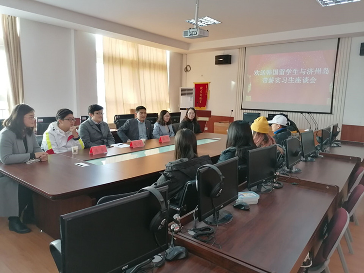 本站讯 12月3日,商务外语系举办赴韩国留学与济州岛实习学生座谈会,烟台国际经济技术合作集团部长张坤、陈豪,商务外语系李刚,应用韩语教研室教师和出国学生出席了本次会议。