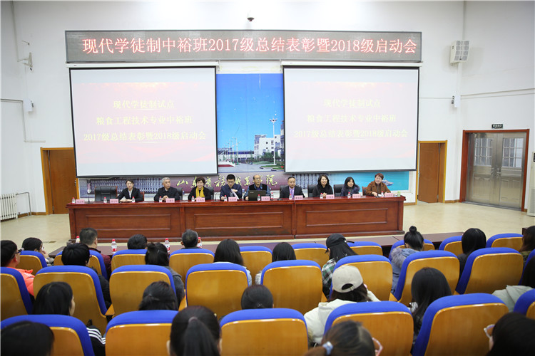 本站讯 为贯彻落实教育部关于深化产教融合、校企合作,进一步完善校企合作育人机制,创新技术技能人才培养模式。12月25日下午,食品工程系在图书馆二楼报告厅,举办现代学徒制中裕班2017级总结表彰暨2018级启动会。会议由食品工程系李苹苹主持,系部王道波、王德学,教务处于邢香,发展规划处王风玲及企业该项目负责人董相奇、纪信波等人参加总结表彰大会。