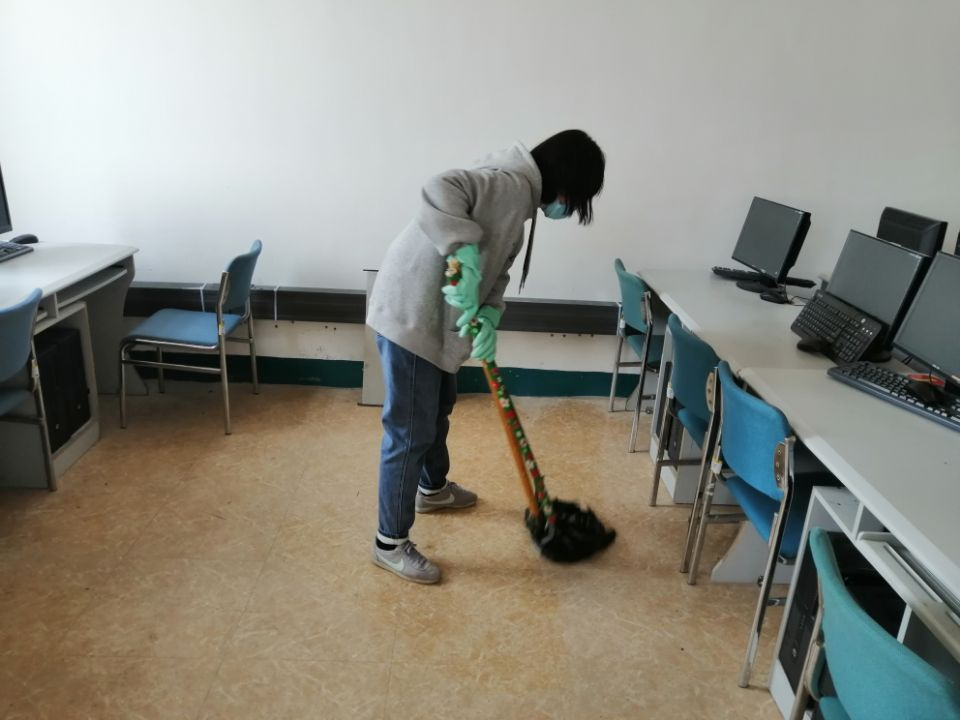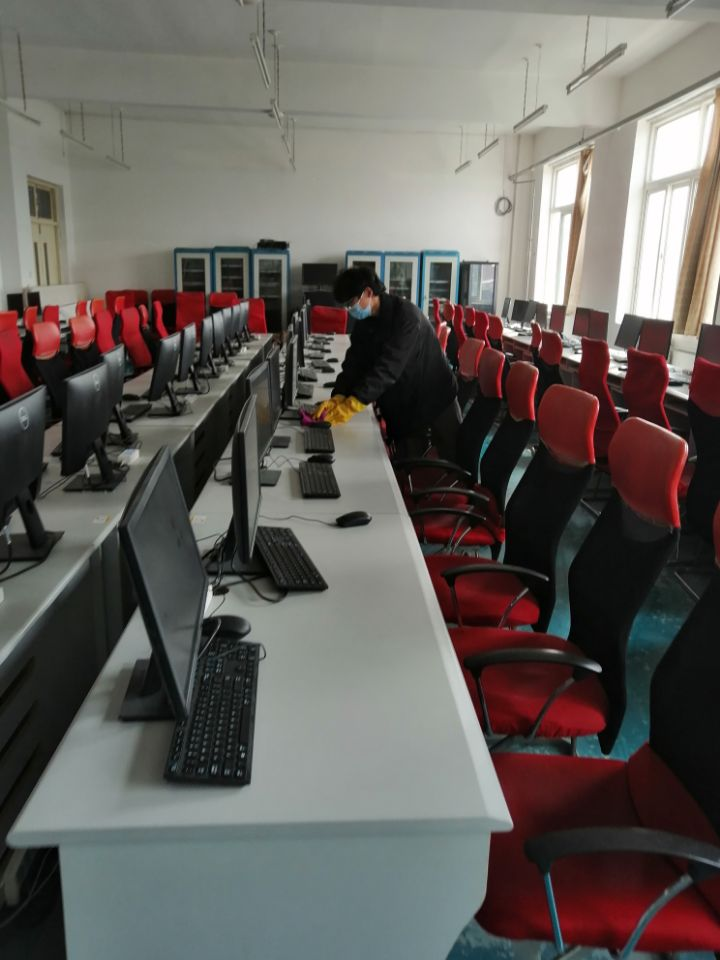 老师带领学生不怕脏、不怕累,分工有序、耐心细致的对艺术设计学院每个实训室进行全面防疫消毒。消毒区域包括电脑键盘、鼠标、实训室门、窗把手等师生经常触碰的地方,实训室地面采用84消毒液整体消毒,消毒后保证开门开窗通风30分钟。