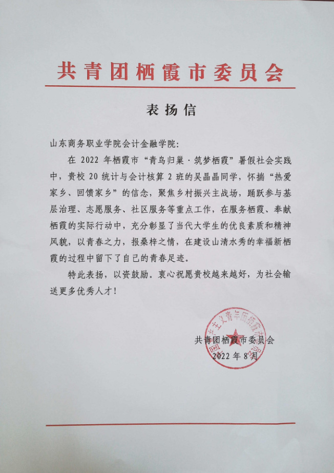本站讯 近日,共青团栖霞市委员会向会计金融学院发来表扬信,对2020级统计与会计核算2班吴晶晶同学聚焦乡村振兴主战场,踊跃参与基层治理、志愿服务、社区服务等工作表示肯定和赞扬,同时对学校的立德树人工作表示感谢。