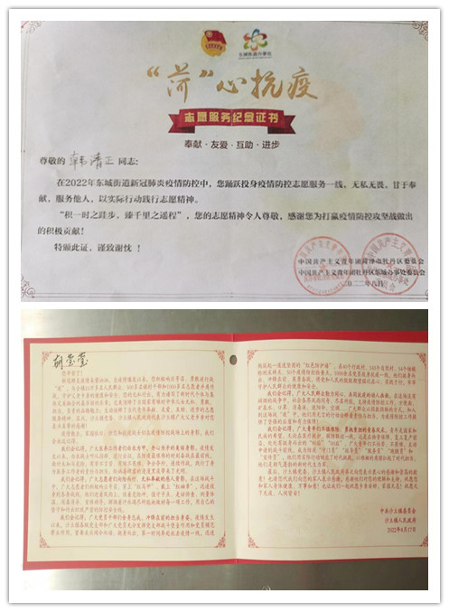 7月中下旬,新冠肺炎疫情再一次突袭菏泽,韩清正同学第一时间报名了当地的疫情防控志愿者,配送生活物资、组织核酸检测、搬运防疫物资、核查人员信息,哪里有需要,哪里就有他的身影。胡莹莹同学在得知社区防疫人手不足时,主动报名加入社区志愿者队伍,协助做好小区门口登记、扫码、测温等核验工作,跑遍整个小区张贴疫情防控宣传海报。