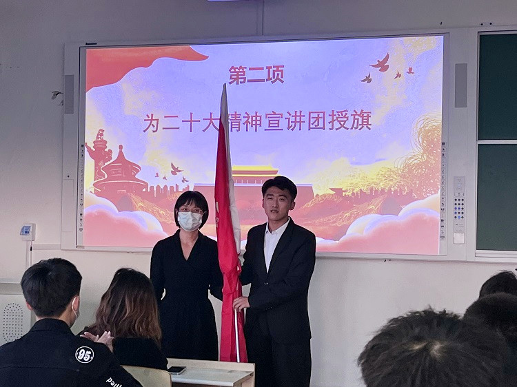 活动现场,学院副院长栾岭雪为学院新一届学生干部颁发工作证并为宣讲团授旗,叮嘱宣讲团成员们,学习宣传贯彻党的二十大精神是我们当前和今后一个时期的首要政治任务,宣讲团成员要从政治上完整准确全面把握党的二十大的重大意义,深入理解党的二十大报告的主题要求和深刻内涵,坚持原原本本学、创新方式讲、联系实际讲,深入推动党的二十大精神落地生根。