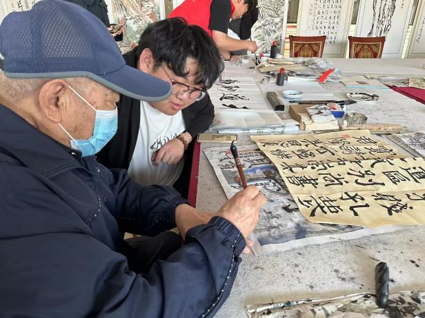 活动中,学院志愿者与老年公寓书画协会的成员现场交流书法绘画心得,管秉海会长为学生进行现场指导,讲解水墨画和毛笔书法用笔技巧。艺术学院合唱团为老人们送上《星辰大海》《我爱你中国》等歌曲,老人们被同学们的热情感染,与师生合唱了《打靶归来》。97岁的抗战老红军孙佑杰老人谈到,我们今天美好生活来之不易,希望同学们听党话、跟党走,立志做有理想、敢担当、能吃苦、肯奋斗的新时代好青年。活动现场,学院师生还为老人们讲解了智能手机的使用方法,并向御花园老年公寓赠送了学院师生设计的购物袋、免洗洗手液、口罩等物品。
