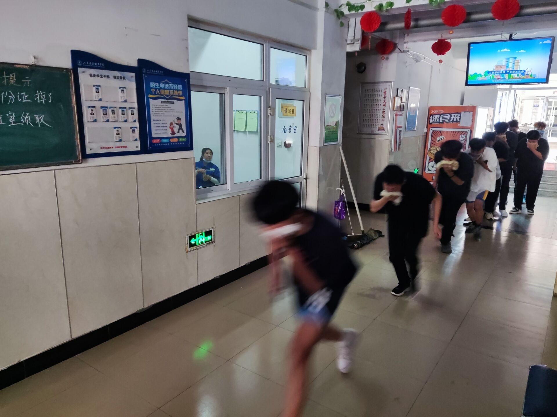 当急促的警报声响起,演练正式开始。学生按照演练方案立即各就各位,各班辅导员老师迅速组织学生撤离。为防止演练过程中出现安全事故,宿舍楼梯有教师负责疏散,指挥学生用毛巾捂住口鼻,沿指定路线低头弯腰快速下楼,有序撤离到宿舍外围的安全地带。历时3分钟,所有学生安全撤离,辅导员老师迅速清点人数,并报告组长。