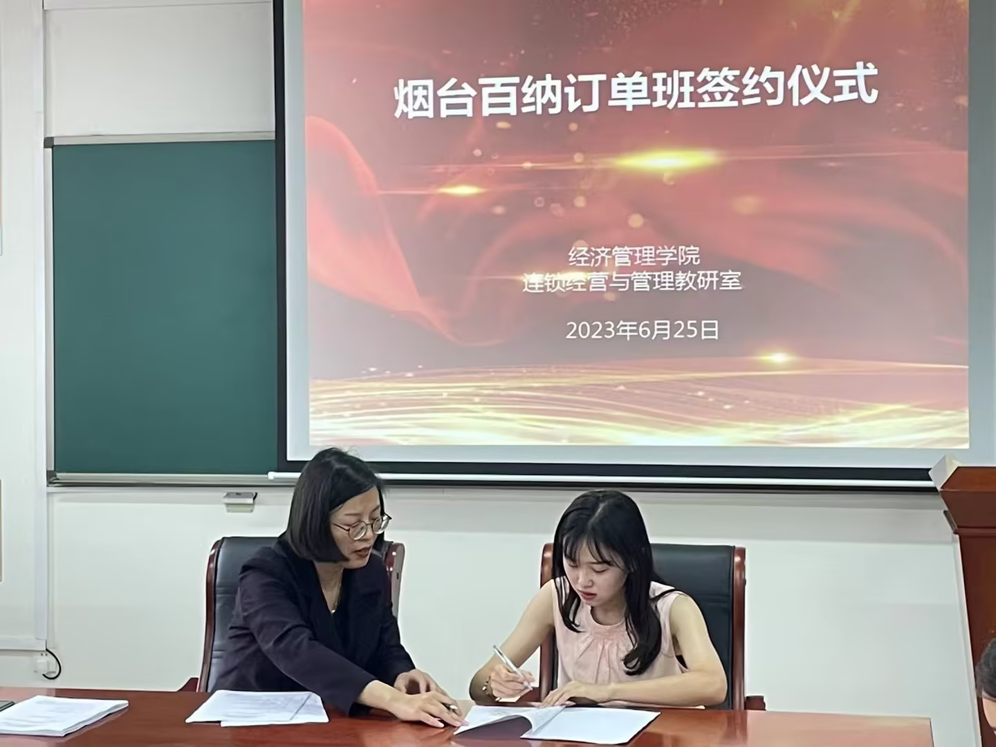 本站讯 6月25日,经济管理学院与青岛百果园食品有限公司、烟台百纳餐饮有限公司在一体化教学楼3A311举行“2021级百果园职业店长班”和“2021级百纳职业店长班”签约仪式。百果园加盟部负责人温晓惠、百纳人力资源部经理田冉,经济管理学院连锁经营与管理专业教师及店长班全体学生参加签约仪式。