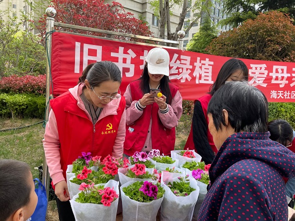 本站讯 为深入推进党史学习教育,将学党史真正落到办实事,增强社区居民环保意识,让图书的价值最大化,5月9日上午,会计金融学院教师党支部联合高新区海天社区,在正元怡居小区举行“旧书换绿植、献爱母亲节活动”。