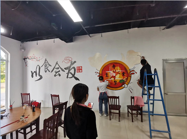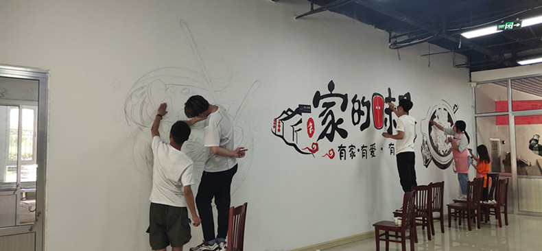 本次墙体彩绘的主题为“有爱、有家、有味道”,旨在诠释“民以食为天”的文化意义,以及中国美食舌尖上的味道,使大家在就餐中感受到“家”的温暖。党员教师和学生志愿者们充分发挥专业优势,通过实地测量、设计沟通、精心绘制,用画笔和调色盘勾勒描绘出色彩斑斓的墙面,为社区居民创造了充满温情的就餐环境,享受到“家”的味道。