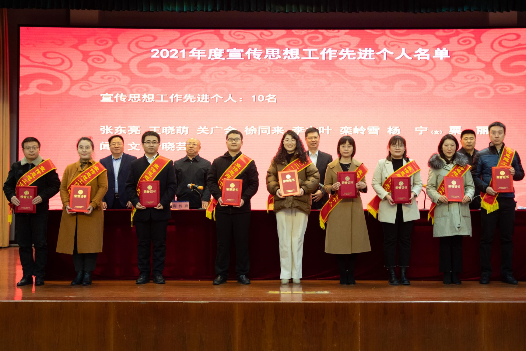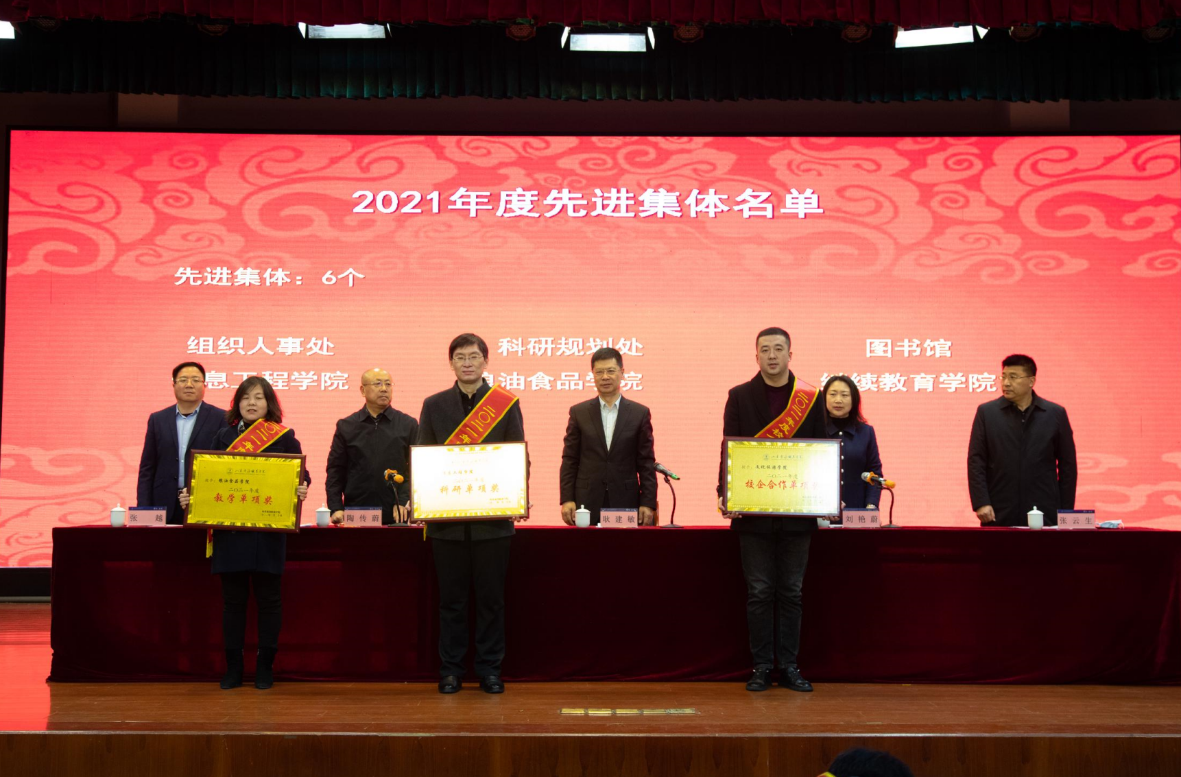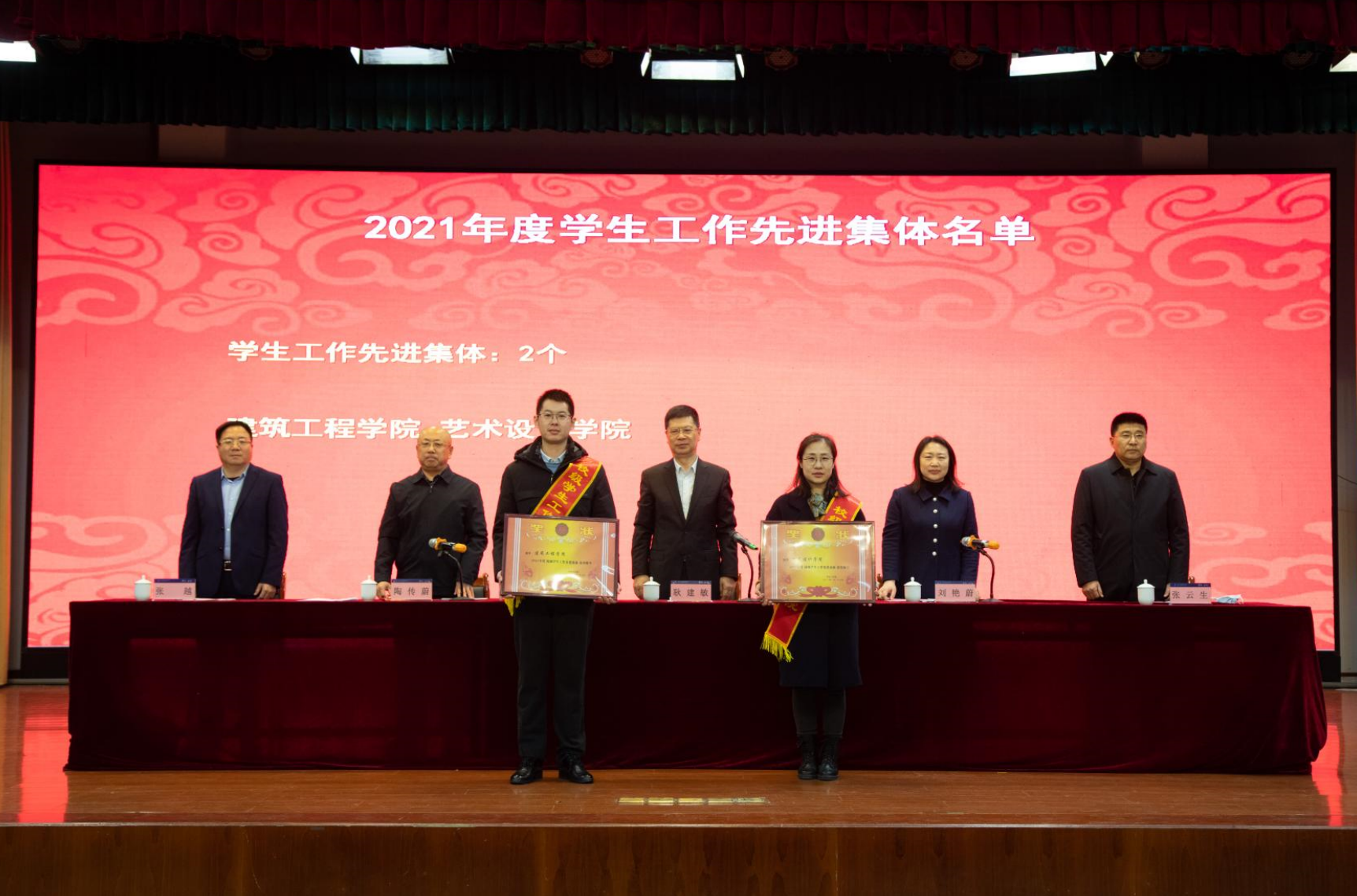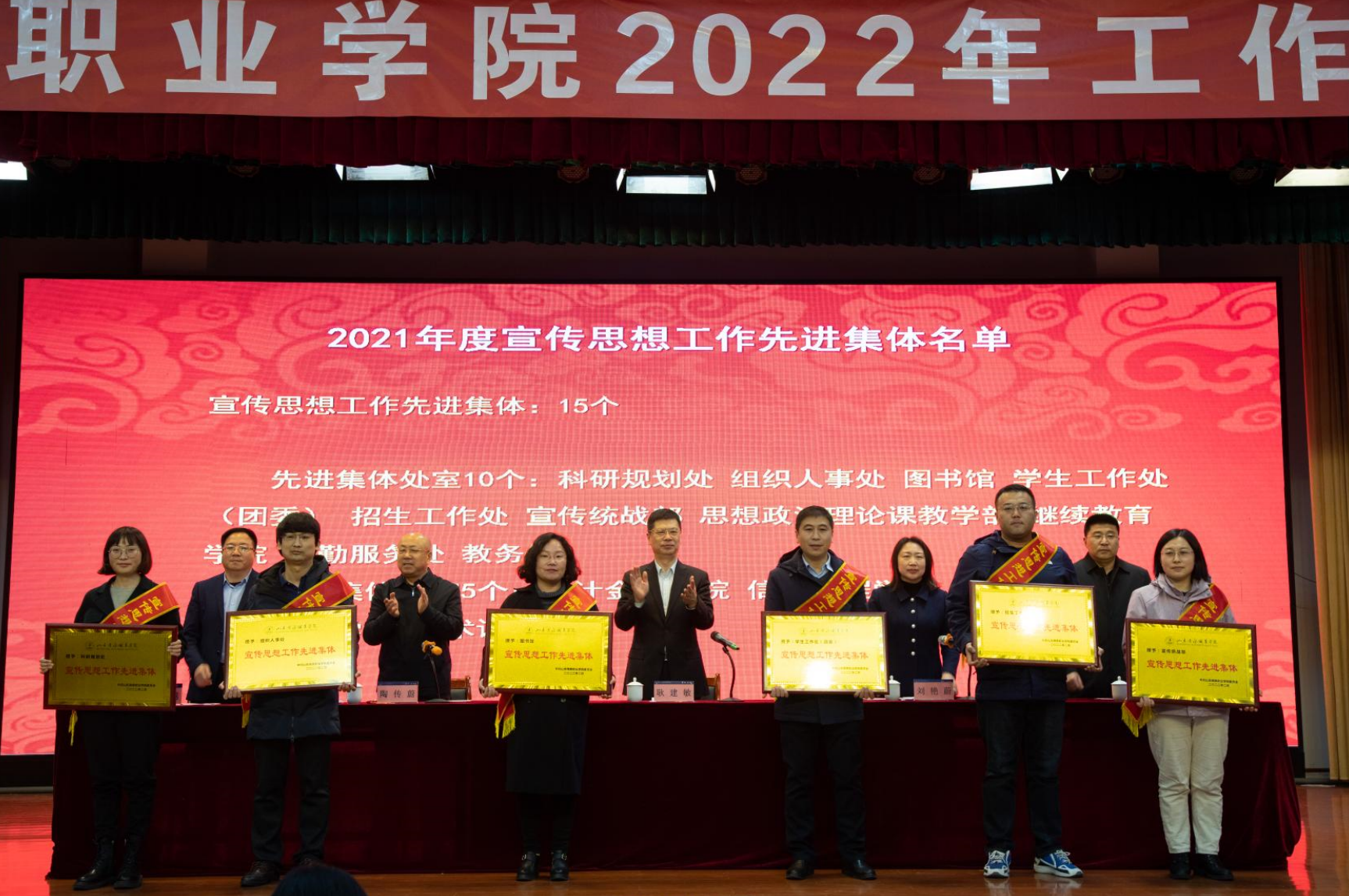 本站讯 3月1日下午,我校组织召开2022年工作动员大会。会议深入贯彻习近平新时代中国特色社会主义思想,贯彻落实全省2022年工作动员大会精神,认真总结2021年学校工作,对过去一年为学校高质量发展做出突出贡献的集体和个人进行了表彰,并全面部署2022年学校改革发展的各项任务。学校领导班子成员出席会议,党委书记耿建敏作大会讲话,党委副书记刘艳蔚主持会议。