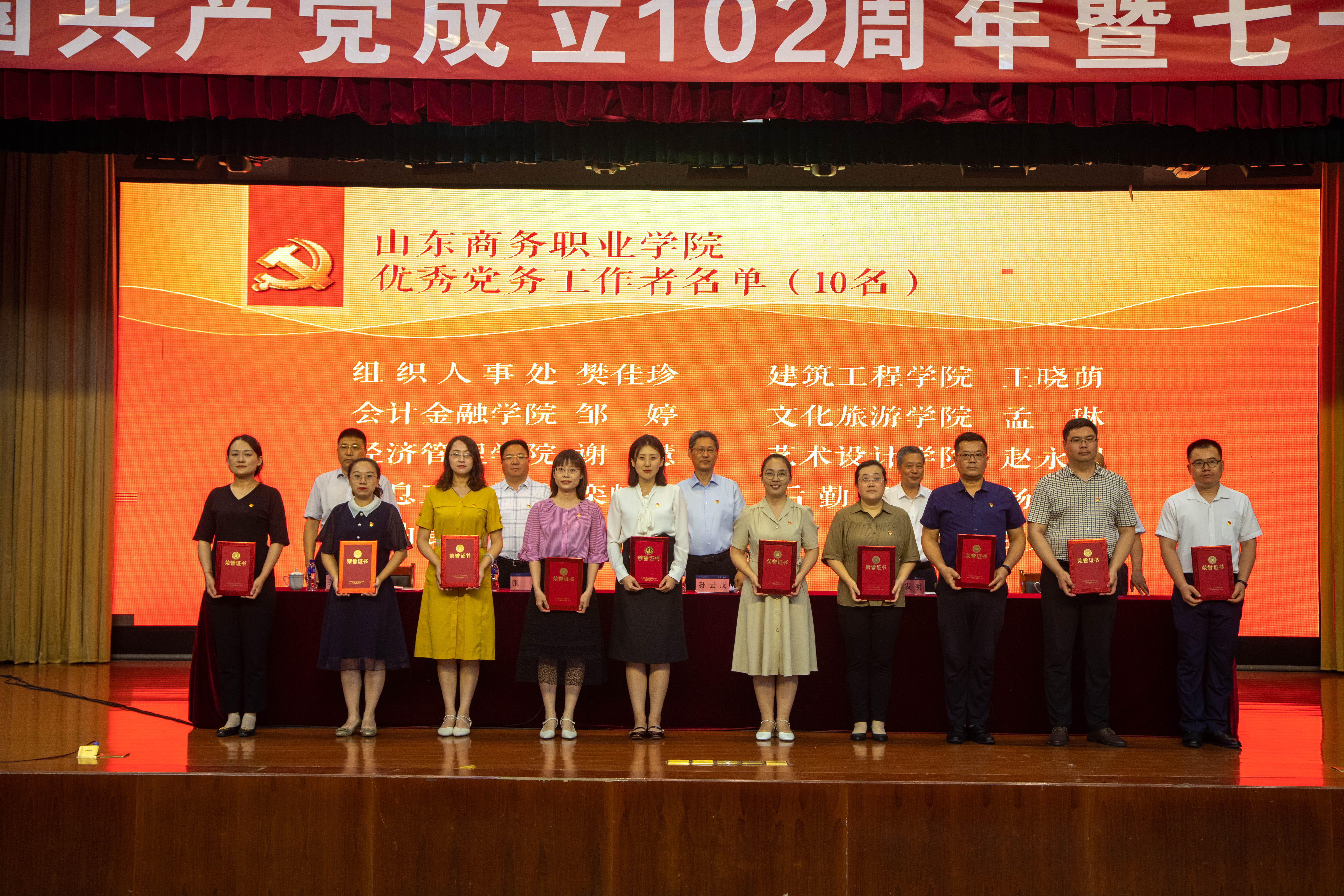 学校领导为“两优一先”获奖集体和个人进行颁奖。获奖人员代表优秀共产党员孙玉林、杨建辉和优秀党务工作者王晓萌作典型发言。
