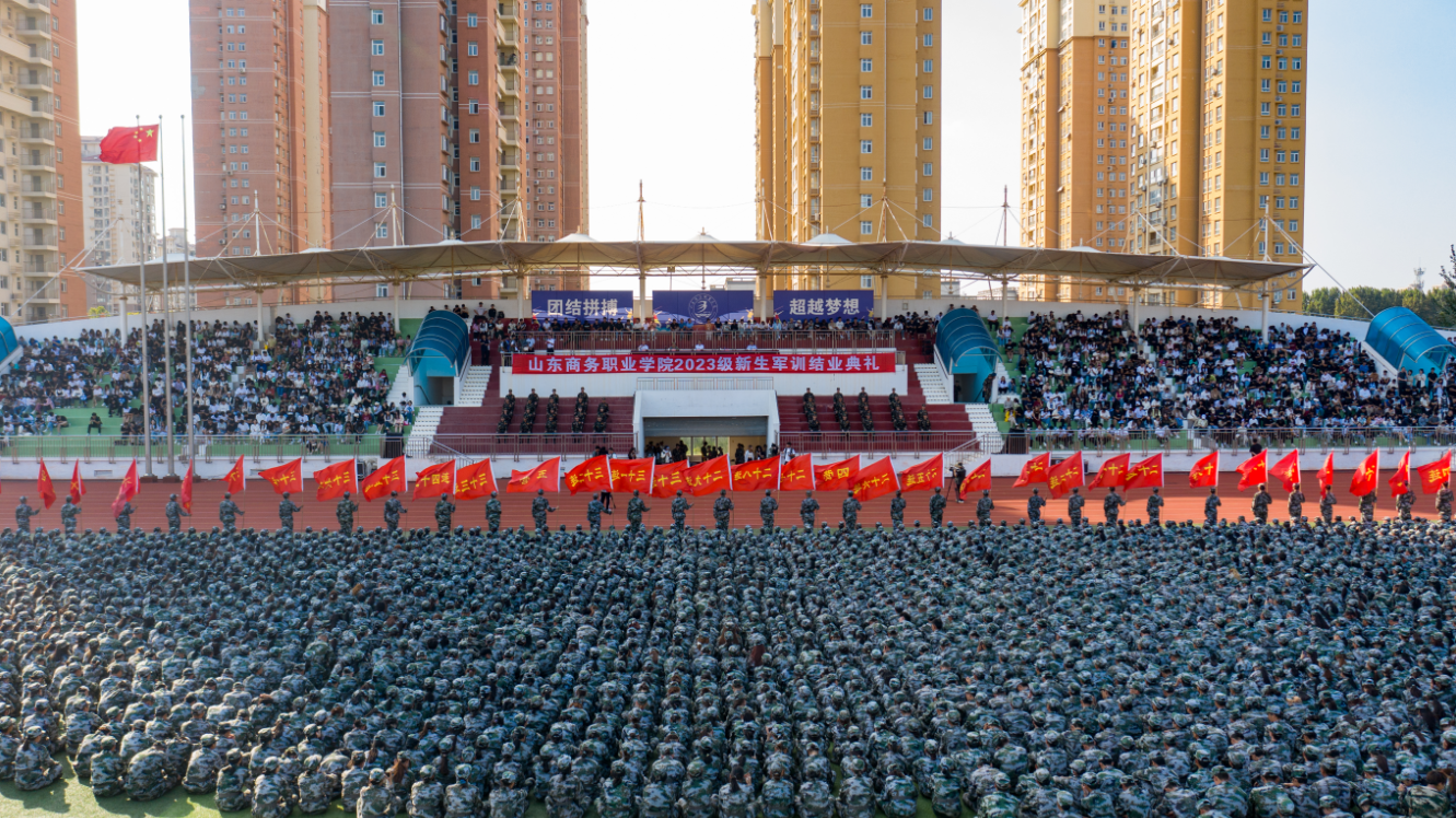 矫健的身姿,整齐的步伐,铿锵的口号,13个分列式方队整齐划一通过主席台接受检阅。分列式过后,气势磅礴的字体图形方阵依次组成“山东商务”“1975 2023 48”“明德 立信”“我爱祖国”“我爱商务”“党旗”“请党放心 强国有我”图样, 将军训汇报表演推向高潮。