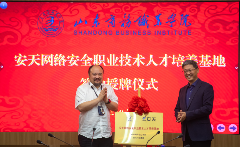 会上,孙云茂和肖新光代表校企双方为安天网络安全职业技术人才培养基地揭牌;王发明和吴菁代表校企双方签约。