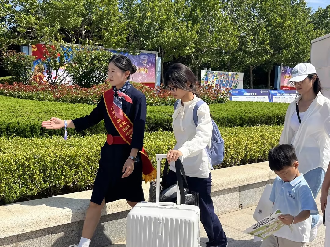 迎新现场,拱门矗立、横幅高挂、彩旗飘扬、锣鼓阵阵,指示牌随处可见,处处展示着喜庆与热情,洋溢着浓厚的迎新氛围。校园里随处可见身着各色“马甲”的志愿者,从注册报到、答疑解惑、耐心指引到行李搬运、物资领取、宿舍安排,志愿者们用心用情迎接新生到“家”。各处室、院部在现场设立服务台,为新生提供绿色通道、学籍、医疗、生活等方面的咨询与保障服务,同时通过心理加油站、非遗作品展等活动展示学校及学院特色,引得众多新生和家长驻足观看。中心大道上精心设计的的迎新展板,为新同学留下最美初印象,同学们纷纷在展板前留下真诚的笑脸,用镜头定格难忘瞬间。