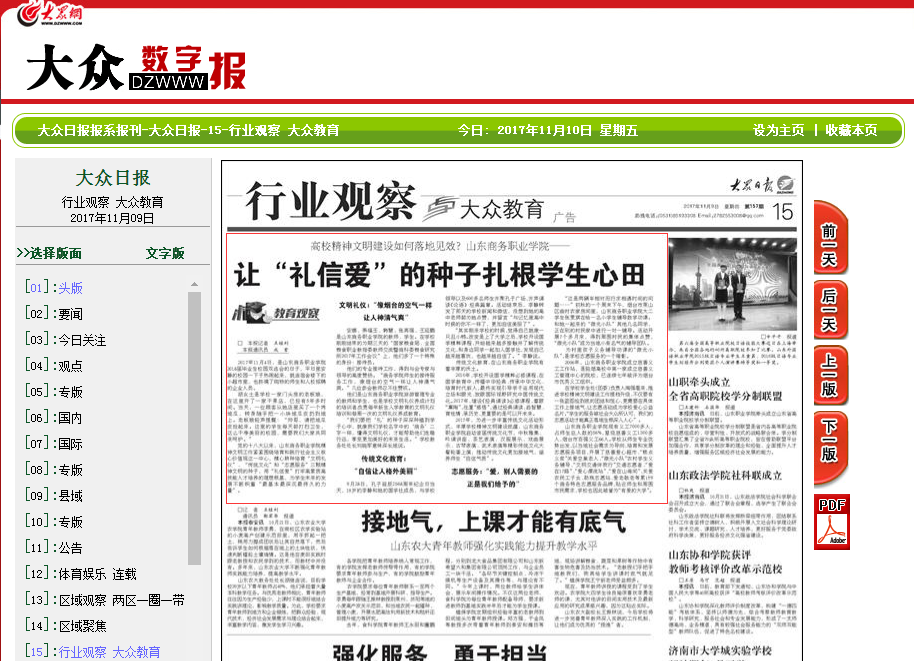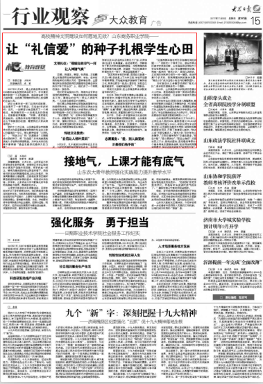 本站讯 2017年11月9日,《大众日报》在15版“行业观察 大众教育”版面,专题报道我校精神文明建设成果,具体刊文内容如下。