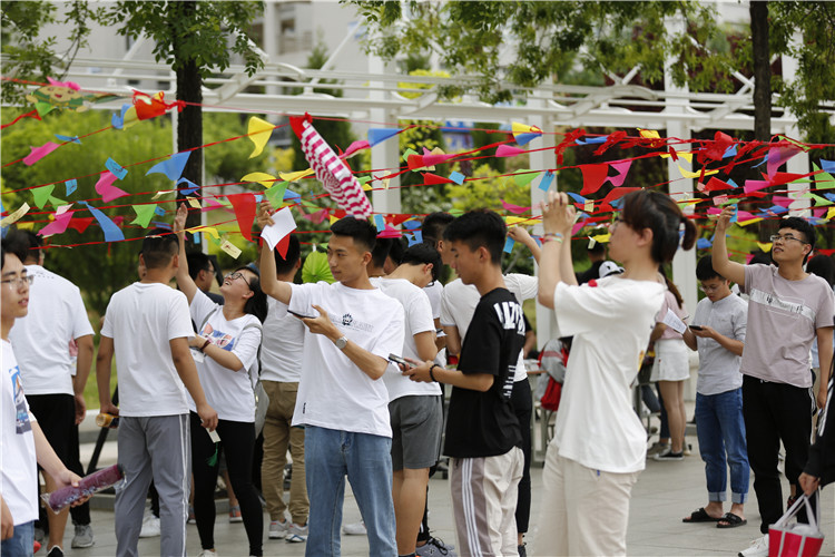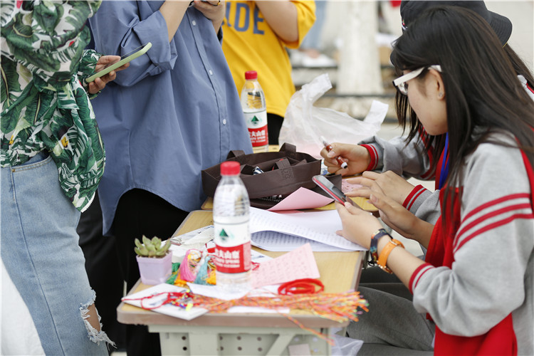 为了这次活动,图书馆老师们提前一个月就开始策划筹备,并提前一天将100条彩旗悬挂在中心大道,早早营造起节日氛围。活动当天上午,图书馆将精选的1000道谜语和古诗题悬挂在彩旗上,过程中引来了下课路过这里的同学们围观,活动尚未开始便迎来一小波火爆场面。下午两点左右,活动正式开始,图书馆老师们、饮食中心的师傅们、图书馆学管会的同学们,按照事先安排好的工作岗位,各就各位,忙的不亦乐乎。同学们也陆陆续续从四面八方走进活动场地,咨询活动规则,领答题卡,认真答题。活动规定答对10道、20道、40道题目可获得相应的奖品,活动题目涵盖了我们耳熟能详的古诗词名句和简单易猜的谜语,同样也有许多生僻的古诗和难度较大的谜语,想要答对几十道题也并非易事。只见同学们有的“单独作战”,有的“结伴而行”,有的“三五成群”,或靠“最强大脑”,或靠“集体智慧”,都答对了几十道题拿到了自己中意的奖品。奖品有读书节纪念品,也有端午五彩绳、小香囊,还有多肉植物。同学们非常喜欢这些奖品,尤其是五彩绳和小香囊,领到后迫不及待地戴上手腕,“彩线轻缠红玉臂,小符斜挂绿云鬟”,浓浓的端午节日的喜悦气氛就这样萦绕在同学们的身边和心间。