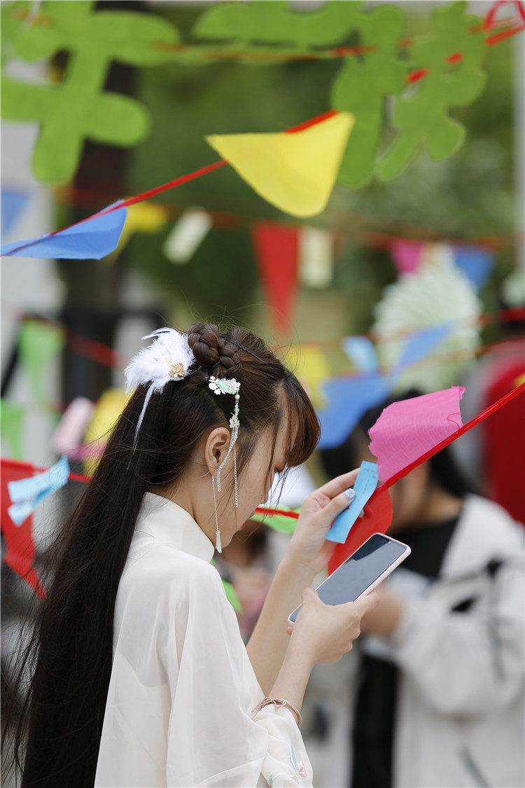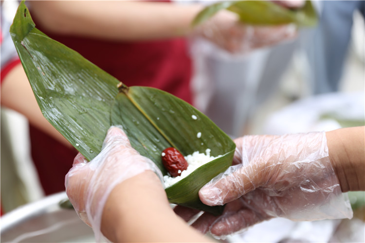 除了猜谜语、领奖品,同学们还现场观摩和体验了包粽子“绝活”。现在的大学生都是00后,对于许多中国传统手艺例如包饺子、包粽子、包汤圆等面活都是“会吃不会做”,渐渐成了学生们眼中的“绝活”。为了能让同学们传承起这份包粽子的手艺,饮食管理中心副主任孙海刚邀请了第一食堂的三位包粽能手,手把手教同学们把粽叶折叠成漏斗形,放入糯米红枣,然后用粽叶包住糯米,用棉绳缠绕固定。整个过程,同学们学的非常认真,包的粽子也是有模有样。粽子包完后,师傅们将粽子带回食堂煮熟后拿回现场,同学们品尝着自己包的粽子,那份成就感和内心无比的喜悦,随着粽香,弥漫在整个活动现场。现场还有汉服社、吟诵社、国学社的同学们助阵,表演了契合节日主题的舞蹈,朗诵了屈原的《离骚》和《山鬼》,给活动增添了一抹浓浓的传统文化色彩。活动持续了4个多小时,在这四小时里同学们体验到的不仅有传统文化的魅力、DIY的乐趣、彩旗飘展的惬意,更有团结协作、凝心聚力、互助友爱的团队精神和友谊之光。活动先后共有千余名同学参与,纷纷表示体验愉悦,收获颇丰。