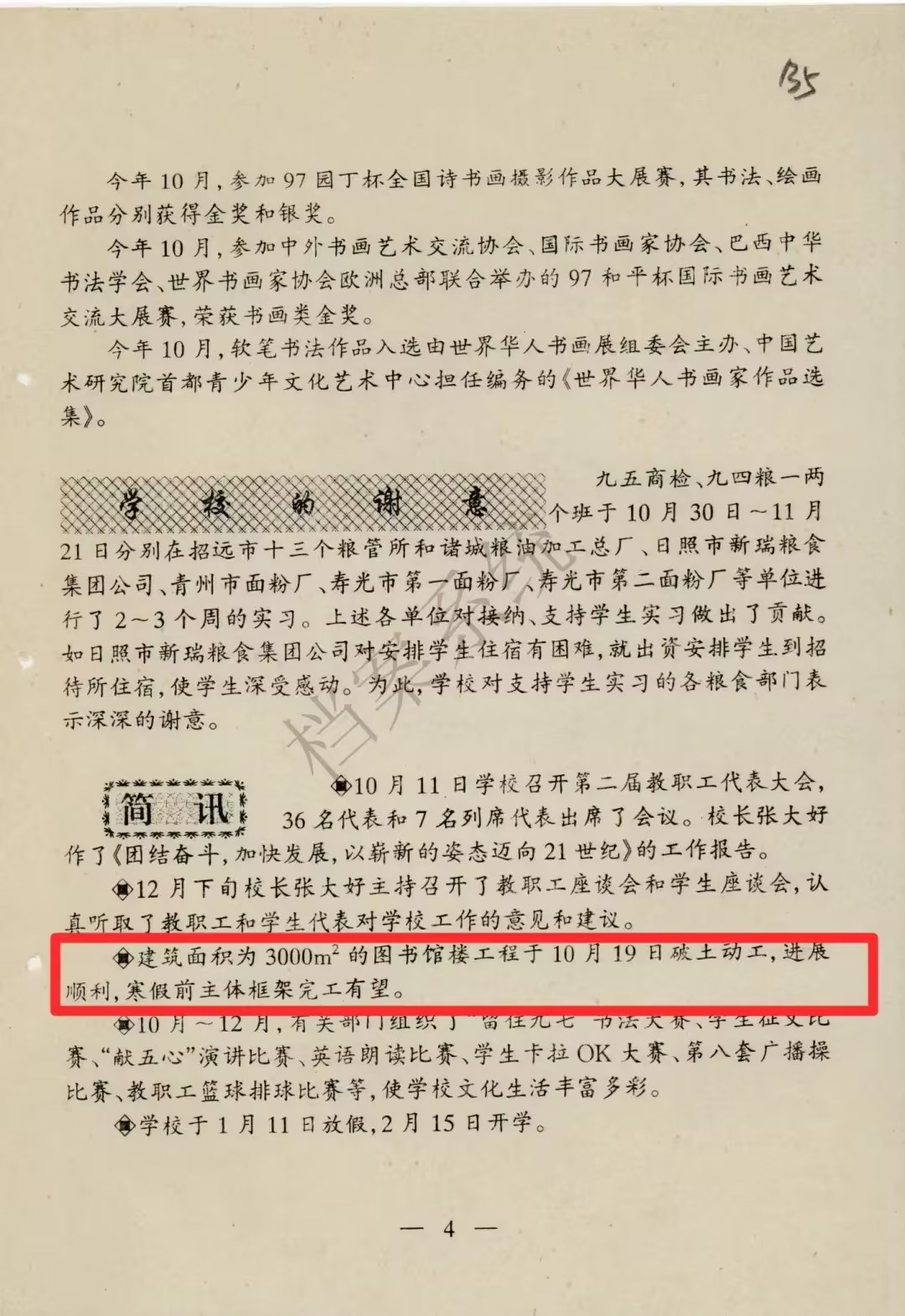 1997年10月19日,学校图书楼立项开工。(1997年的校内刊物《校园通讯》在“简讯”栏目中,对这一事件进行相关记载。)总建筑面积为2640㎡,分为三层,第一层为书库,第二层为阅览室,第三层为微机室和语音室。1998年7月,图书楼建成并交付使用。