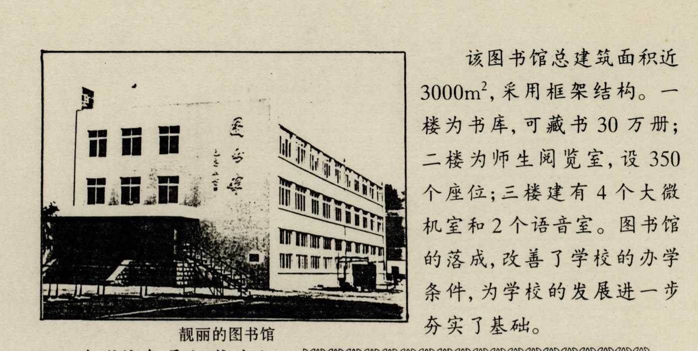 1998年9月1日,学校新建图书馆正式启用,楼内设大厅、两个书库、一个采编室。南书库为上下两层结构,内置新购一体铁制书架244个;北书库暂作教材库使用,待日后藏书量增加,再做书库使用。每个书库设计藏书量为15万册。二楼设有一个阅览室和一个教师资料室。阅览室有座位400个,资料室有各类教学资料3500余册供教师查阅。三楼设有一个多媒体教学室,内存图书及其他光盘100余张,并同一楼微机联网使用,教师既可以在机上备课、制作软件,又可以在机上进行图书目录查询阅读等工作。