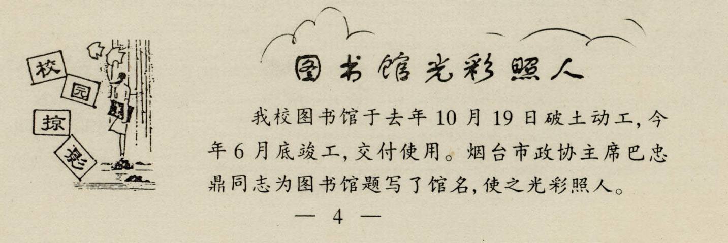 图书馆的落成,改善了办学条件,为学校的发展进一步夯实了基础。据记载,在图书馆交付使用后,烟台市政协主席巴忠鼎同志为图书馆题写了馆名,使之更加光彩照人。
