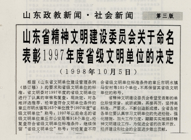 “省级文明单位”是学校自1992年起,连续被烟台市委、市政府授予“文明精神”单位后的重大突破。为勉励师生、勠力前行,山东省烟台粮食学校于1998年11月5日,隆重召开了全校精神文明建设总结表彰大会。