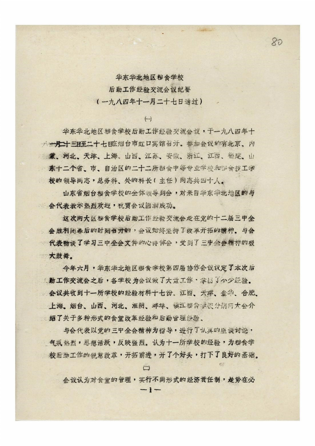 1984年11月23日,华东华北地区粮食学校后勤工作经验交流会议在烟台市虹口宾馆召开,参加会议的有北京、内蒙、上海、浙江等十二个省、市、自治区的二十二所粮食中等专业学校和粮食技工学校的领导同志共四十人。