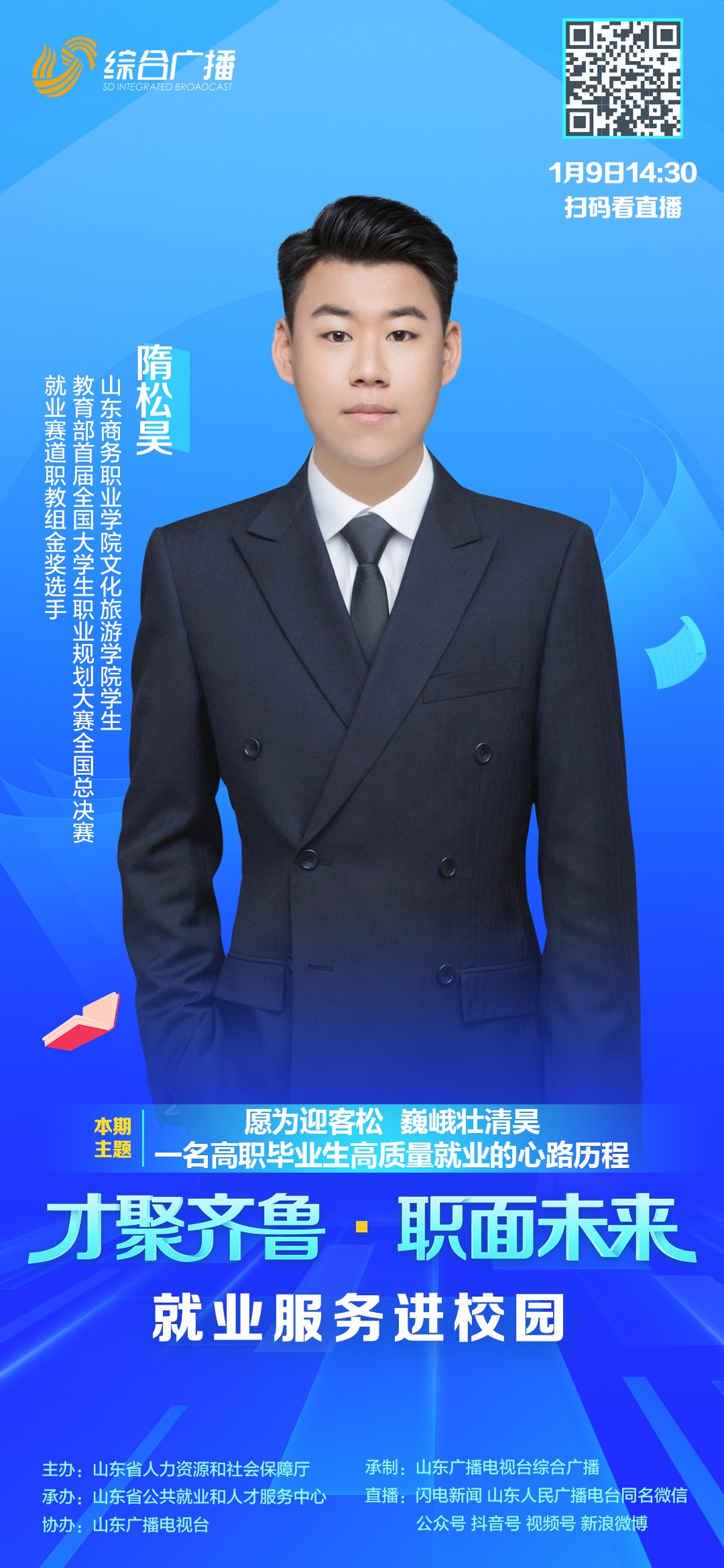本站讯 近日,由山东省人力资源和社会保障厅联合山东广播电视台,面向全省高校共同拍摄制作的2024年“才聚齐鲁·职面未来”公益就业指导直播课已成功上线。我校文化旅游学院2024届毕业生,首届全国大学生职业规划大赛总决赛就业赛道职教组金奖获得者隋松昊(山东省唯一的高职学生代表),以“愿为迎客松 巍峨壮清昊 一名高职毕业生高质量就业的心路历程”为主题,参加了本次专题节目的录制。