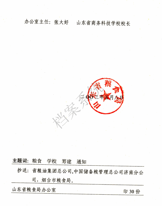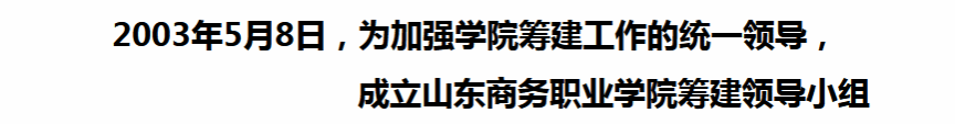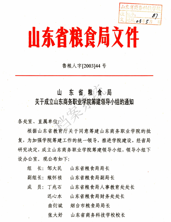 2003年5月8日,根据山东省教育厅关于同意筹建山东商务职业学院的批复,为加强学院筹建工作的统一领导,推进学院建设,经省局研究决定,成立山东商务职业学院筹建领导小组。领导小组下设办公室,由山东省粮食局局长邹大民任组长、副局长缑怀祯任副组长,山东省粮食局人事教育处处长丁兆石、山东省粮食局财务处处长迟心水、烟台市粮食局局长曲衍斌及山东省商务科技学校校长张大好共同组成领导小组。