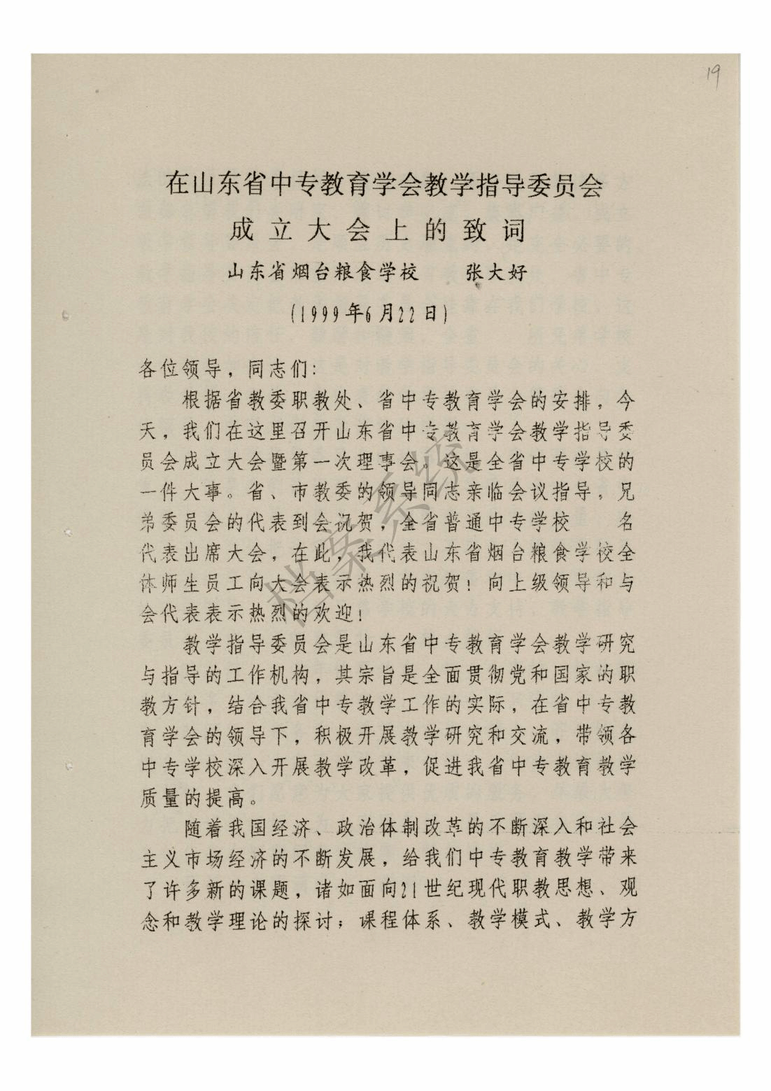 1999年6月22日,山东省中专教育学会教学指导委员会在烟台成立。我校作为委员会挂靠单位,顺利承办山东省中专教育学会教学指导委员会成立大会暨第一次理事会。
